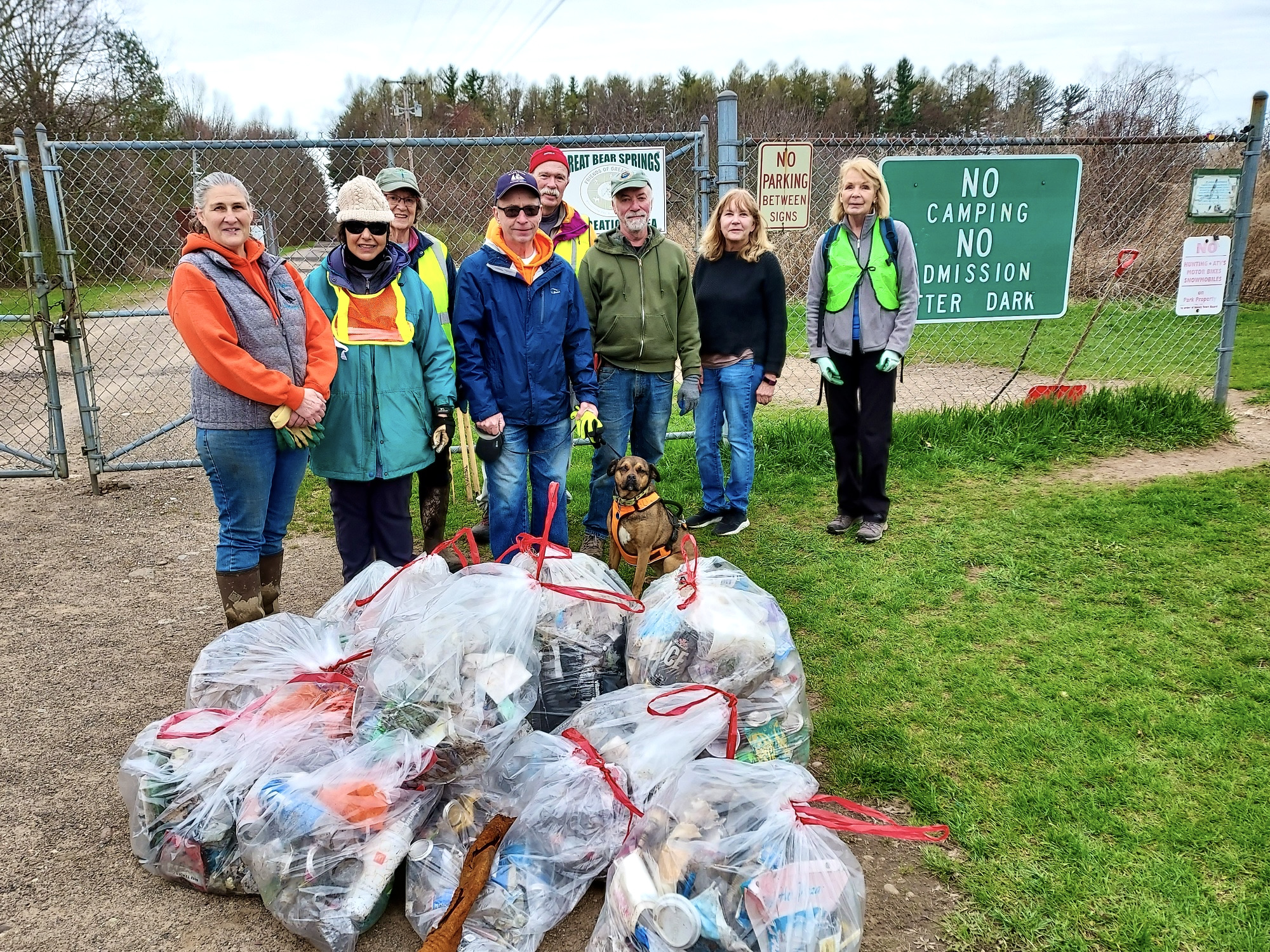 Friends of Great Bear volunteers with collected roadside litter. L-R: Nancy Cooper, Maggie Bocsor, Sandy Bonanno, Brian Donnelly with Jazz, Dick Drosse, Steve, and Laura Jacobsen, Naneen Drosse.