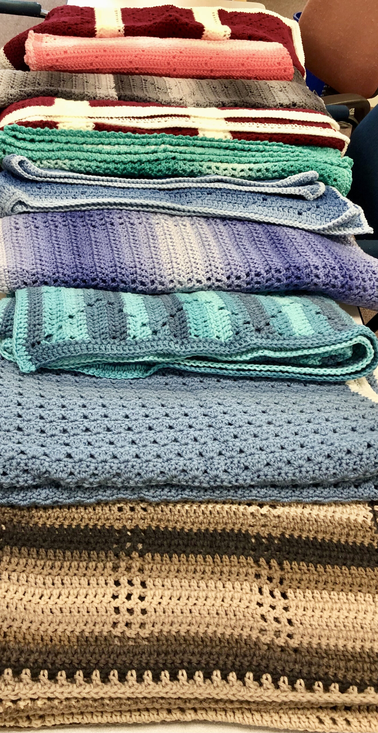 Some of the “lapghans” donated by Brenda Alm to Friends of Oswego County Hospice.