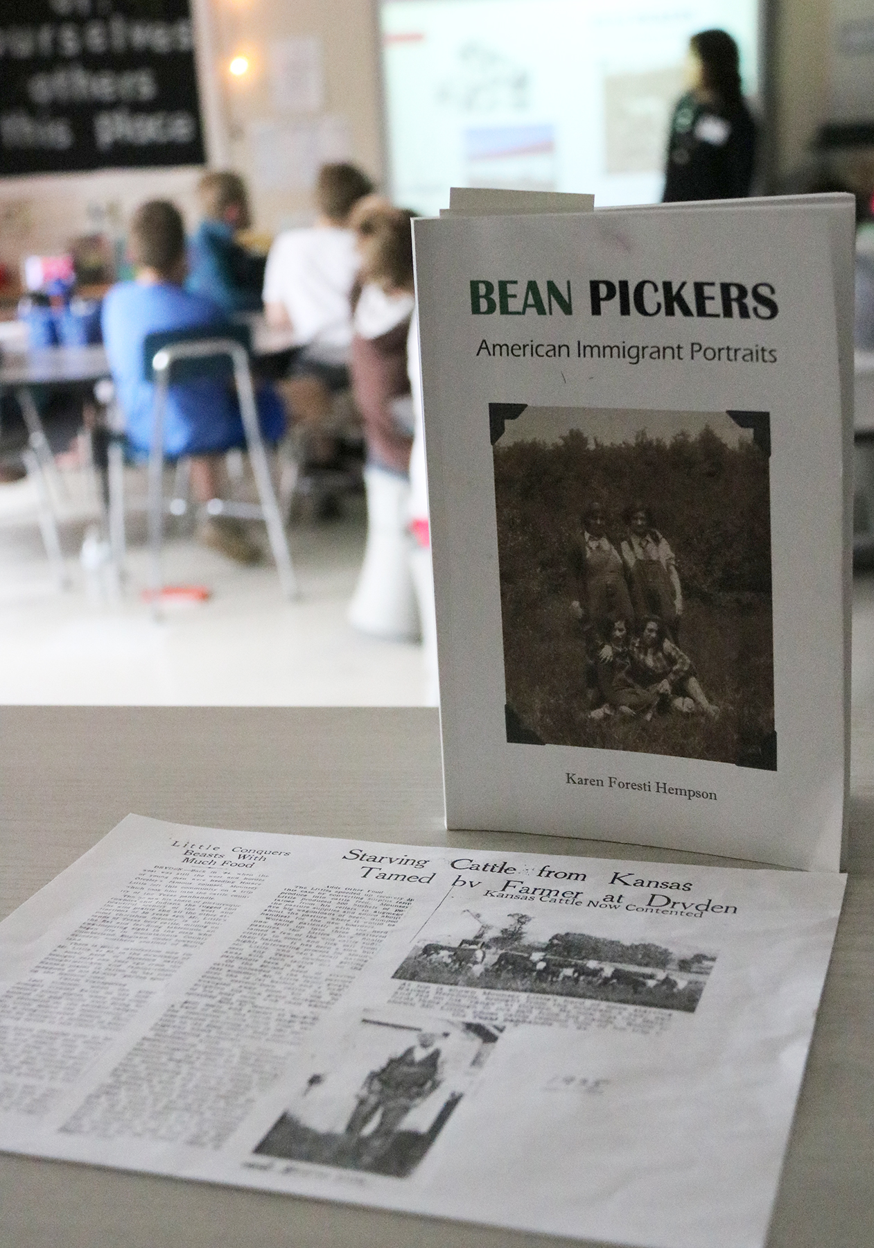 Fourth grade students in Nick Little’s classroom at Fitzhugh Park were recently treated to an author visit when Karen Foresti Hempson came for a visit and read excerpts from her book, “Bean Pickers: American Immigrant Portraits.”