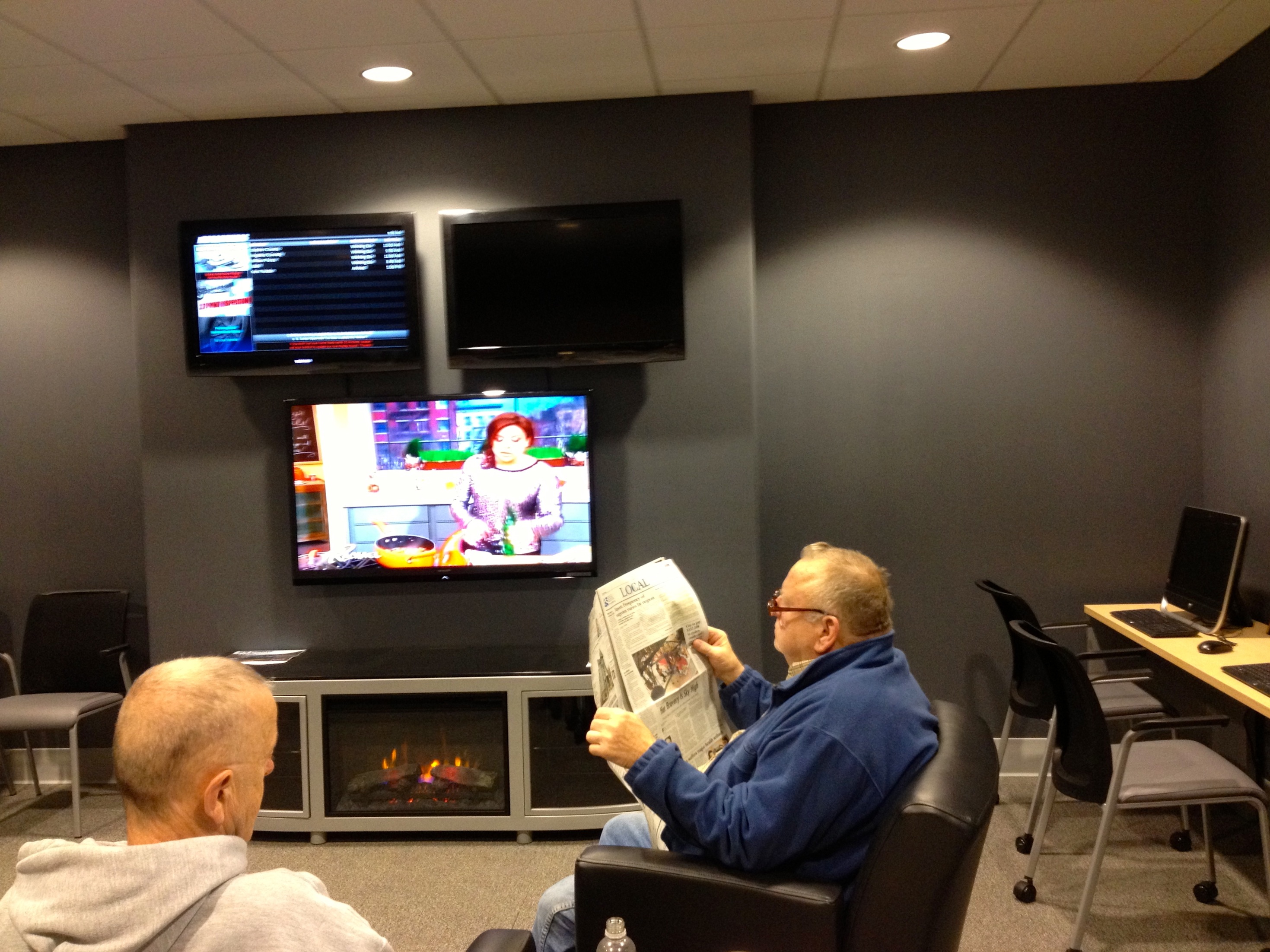 The customer lounge in the expanded and renovated Burritt Motors features a fireplace, comfy chairs, Wi-Fi stations, flat screen TV and flatscreen monitors showing the status of customers’ vehicle service.