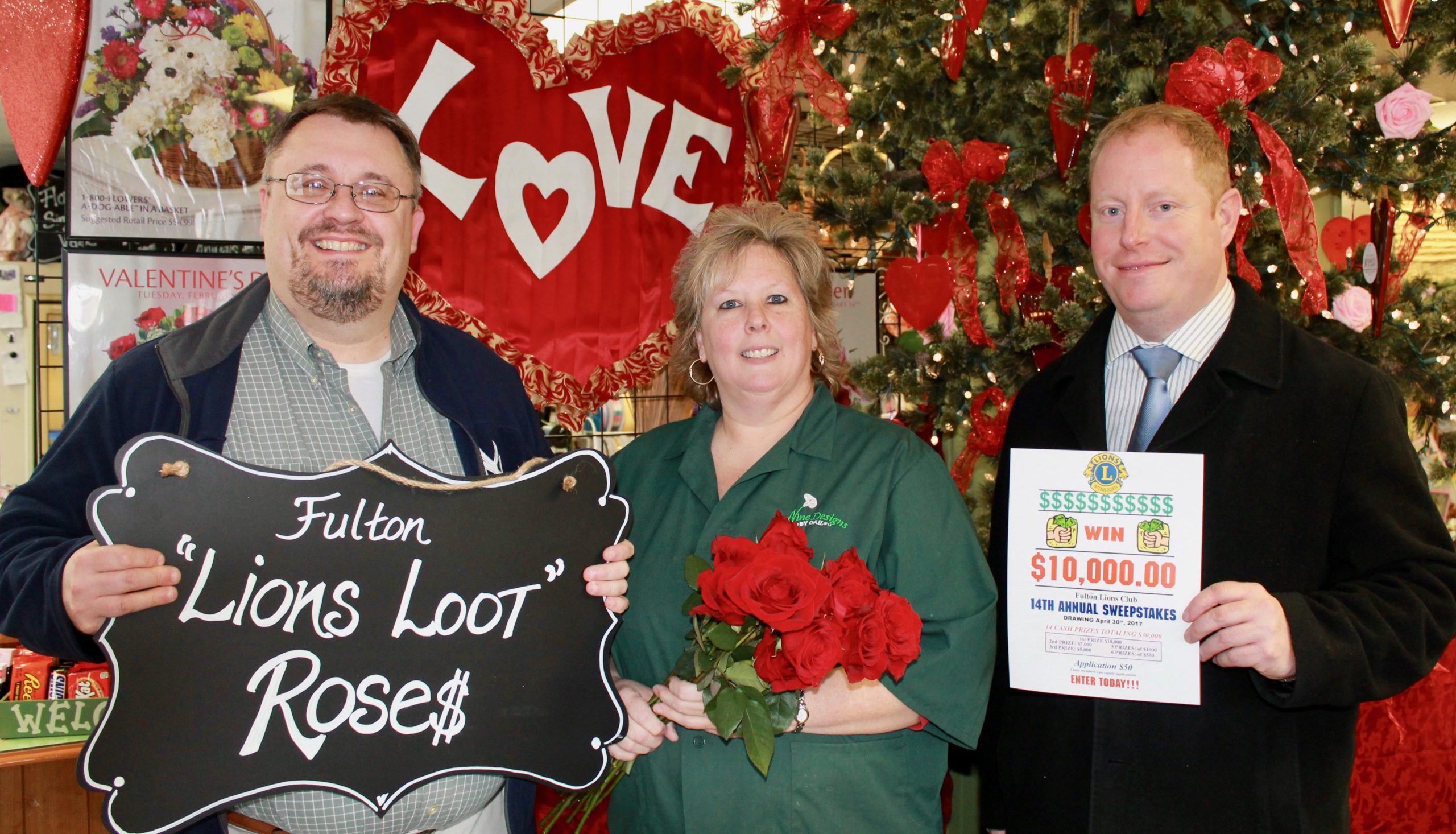Anyone who purchases a Lions Loot Ticket in from Jan. 16 through Feb. 15 will receive a fresh roses for free, announced club President David Guyer, far left. With him is Gail Holmes, owner, Devine Designs and Fulton Lions past president; and Ron Browning, event co-chair. The Fulton Lions Club’s second and final “Lions Loot” sweepstakes Early Bird drawing will be drawn at the Feb. 6 board meeting. A total of five names will be drawn for the prize of $100 each. For an application or more information, contact Browning, 315-561-9021, or download an application online from the event’s Facebook page, “Fulton Lions Loot Sweepstakes,” or applications can be purchased online with PayPal at https://fultonlionsclub.com under ‘What’s Happening.’”