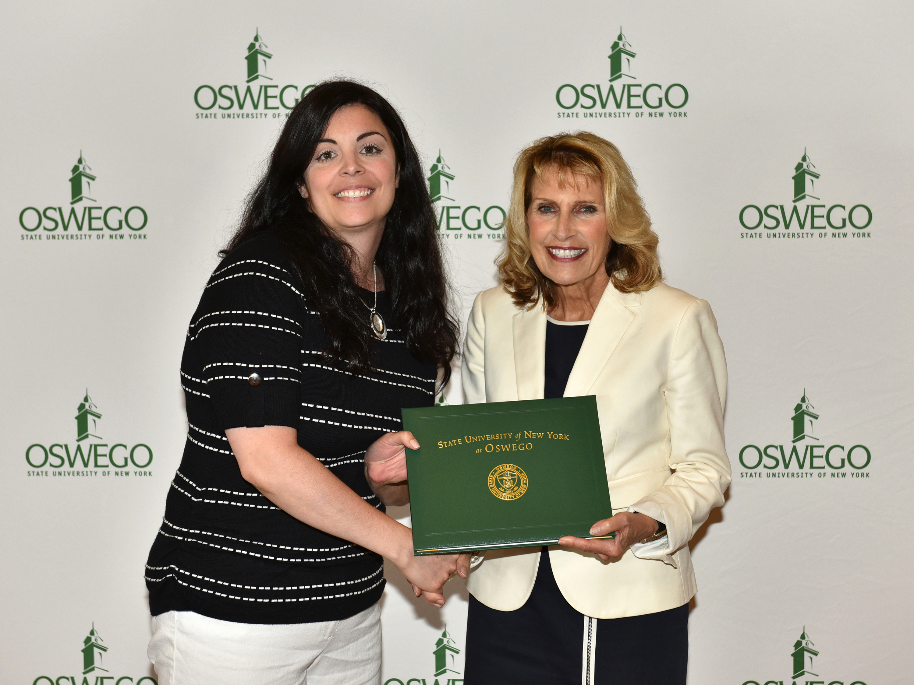Jacqueline Wallace (left) of SUNY Oswego’s Career Services Office recently received the President’s Award for Excellence in Professional Staff Service for outstanding and exemplary efforts. College President Deborah F. Stanley congratulates her on the honor.