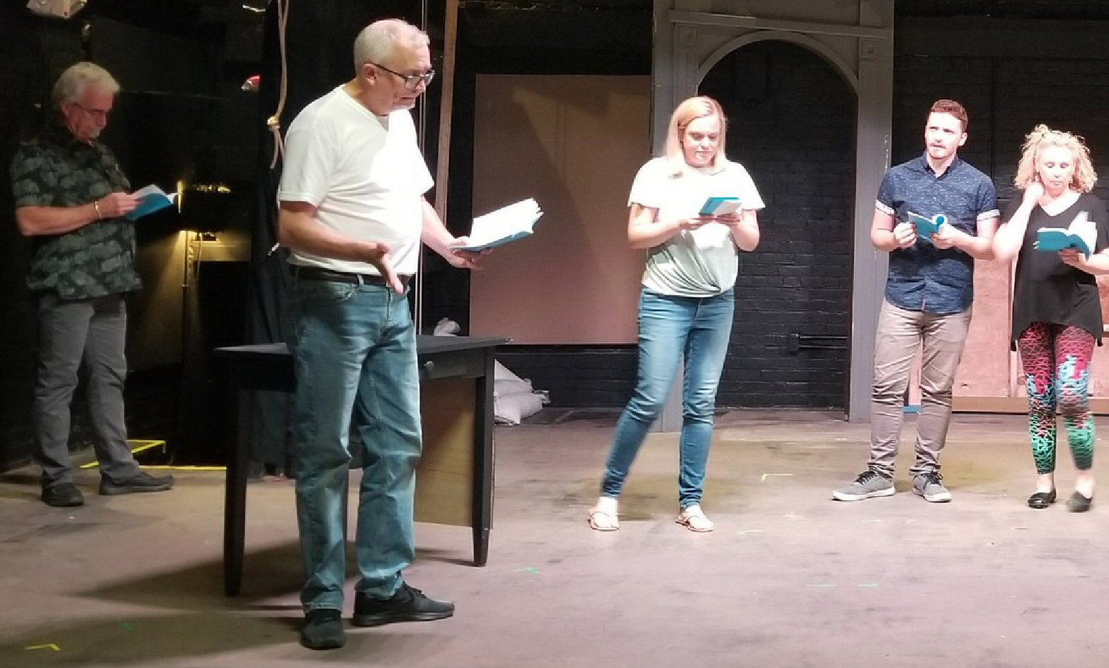 Shown in rehearsal are, from left: Nelson Metz as Jud, Eric Cronk as Dex, Amy Prieto as Charlene, Michael Tuso as Bret and Adele Cronk as Giddy.