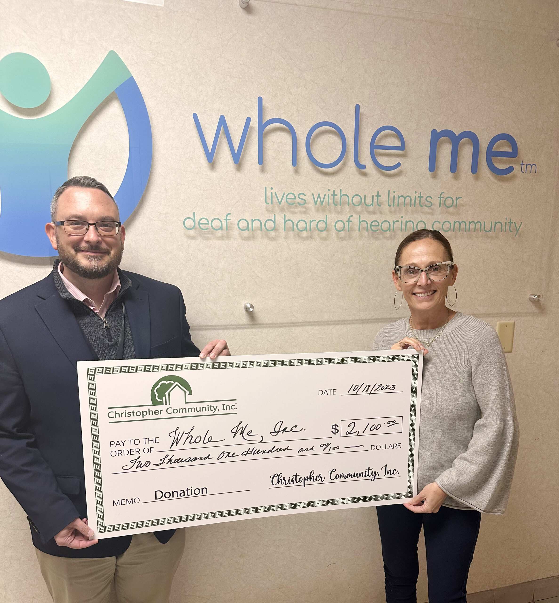 Christopher Community, Inc. President and CEO Justin Rudgick is shown pictured recently with Whole Me, Inc. Executive Director Joelene Orlando, during a check presentation for a $2,100 donation made by Christopher Community and their employees.