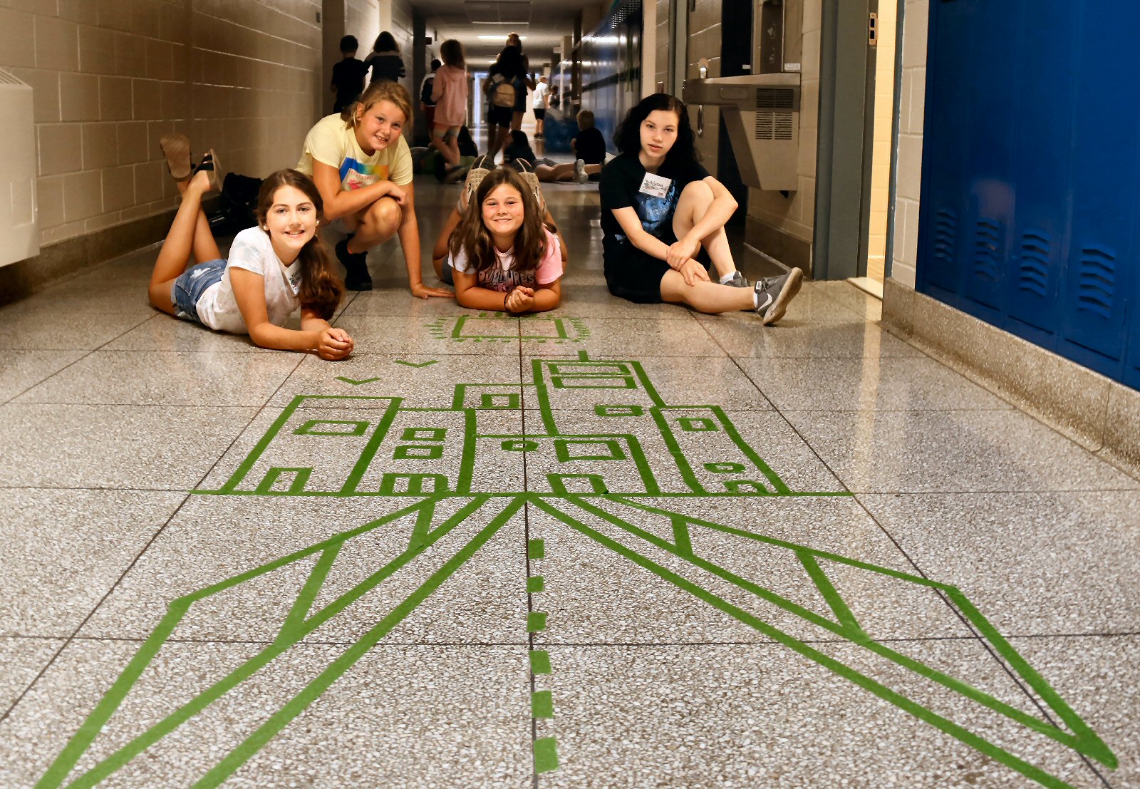 Summer Edge students Mia Duskee, Lyla Duskee, Margo Pritting and Alyssa Murphy demonstrated their understanding of the horizon line exercise by creating a cityscape out of tape on the hallway floor.