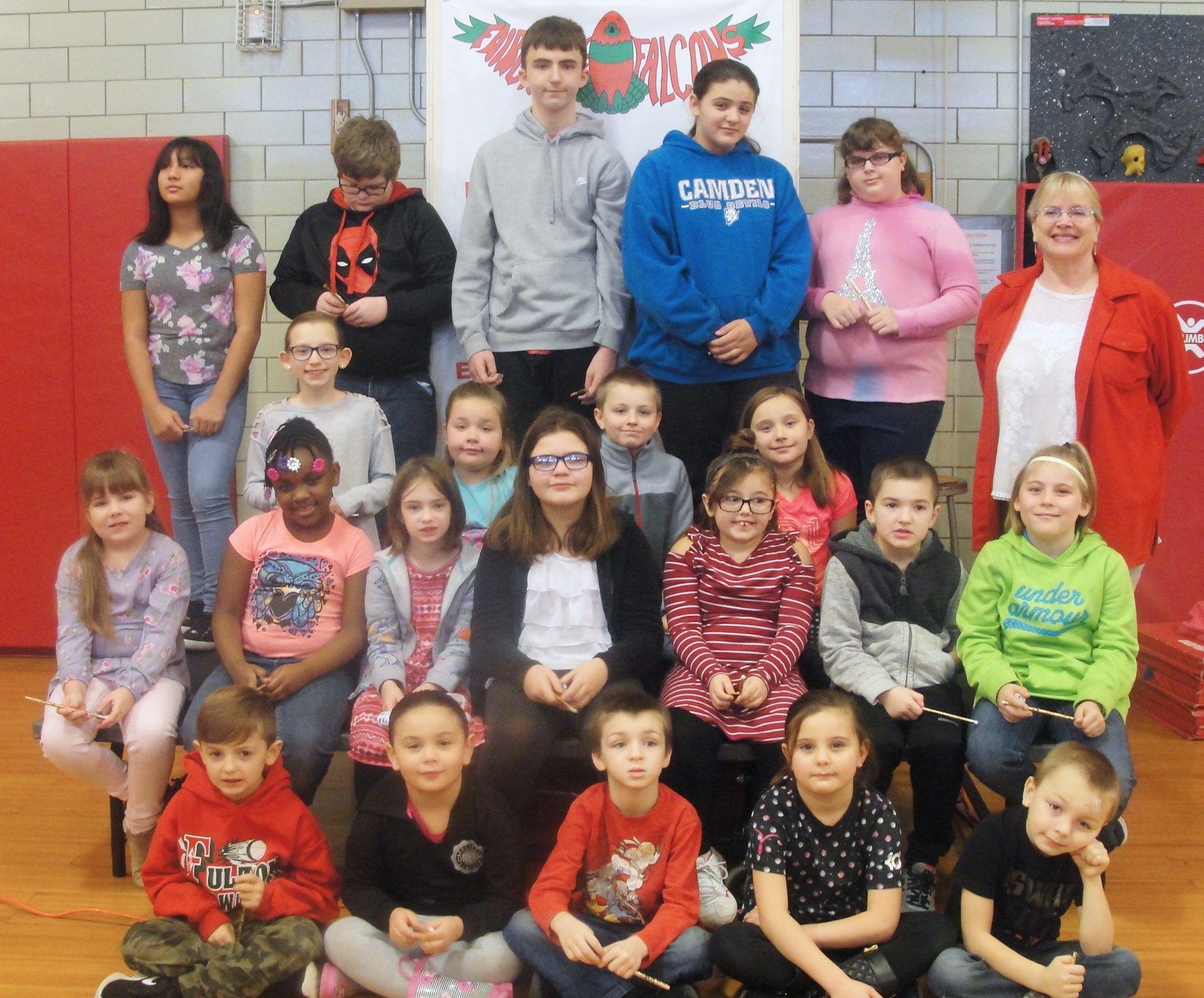 Fairgrieve Elementary student show their excitement upon being named as an expectation expert for the month of November. Standing alongside them is Principal Jean Sampsell, top right.