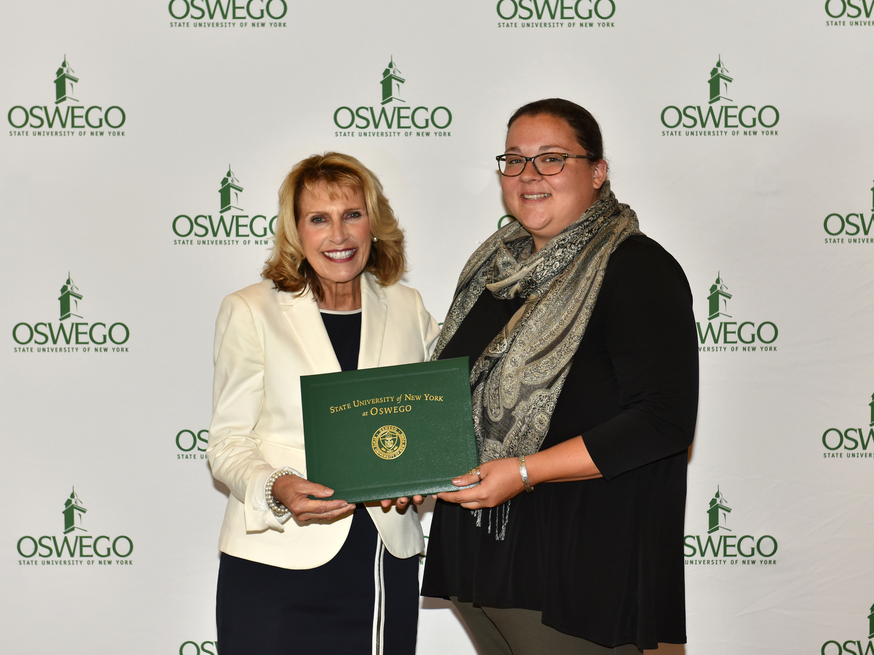 Grace Maxon-Clarke (right), an academic planning counselor for the Educational Opportunity Program at SUNY Oswego, recently received the President’s Award for Academic Advisement for outstanding and exemplary efforts. College President Deborah F. Stanley congratulates her on the honor.