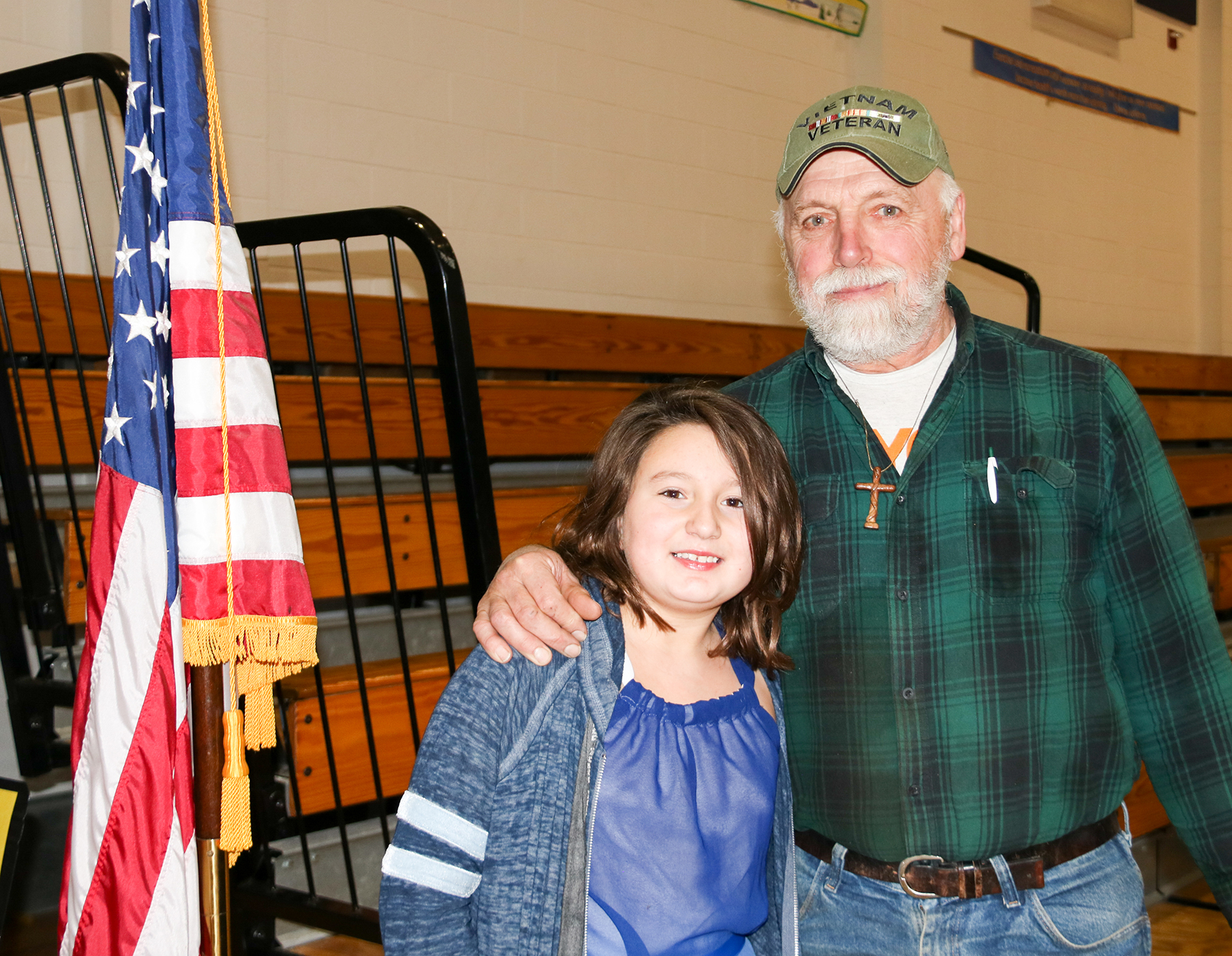 Andrea Grant and her grandfather, Greg Stupp, a veteran, pose for a photo following a recent Veterans’ Day assembly at Fairley Elementary.