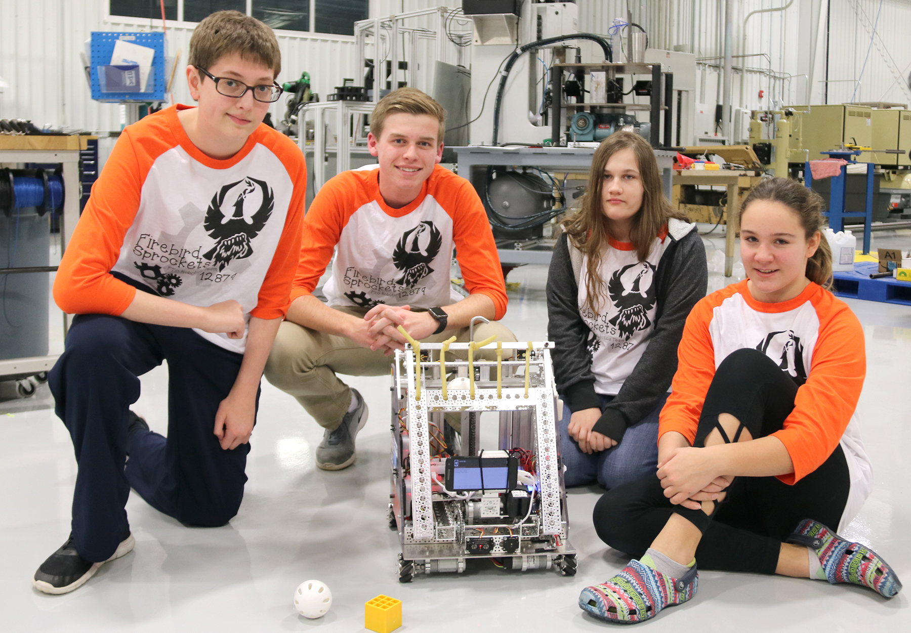 Phoenix Central School District students Jonah Hawthorne, Matt Doane, Ellie Lamath and Sheridan Southworth gather around the robot they built for an upcoming competition.