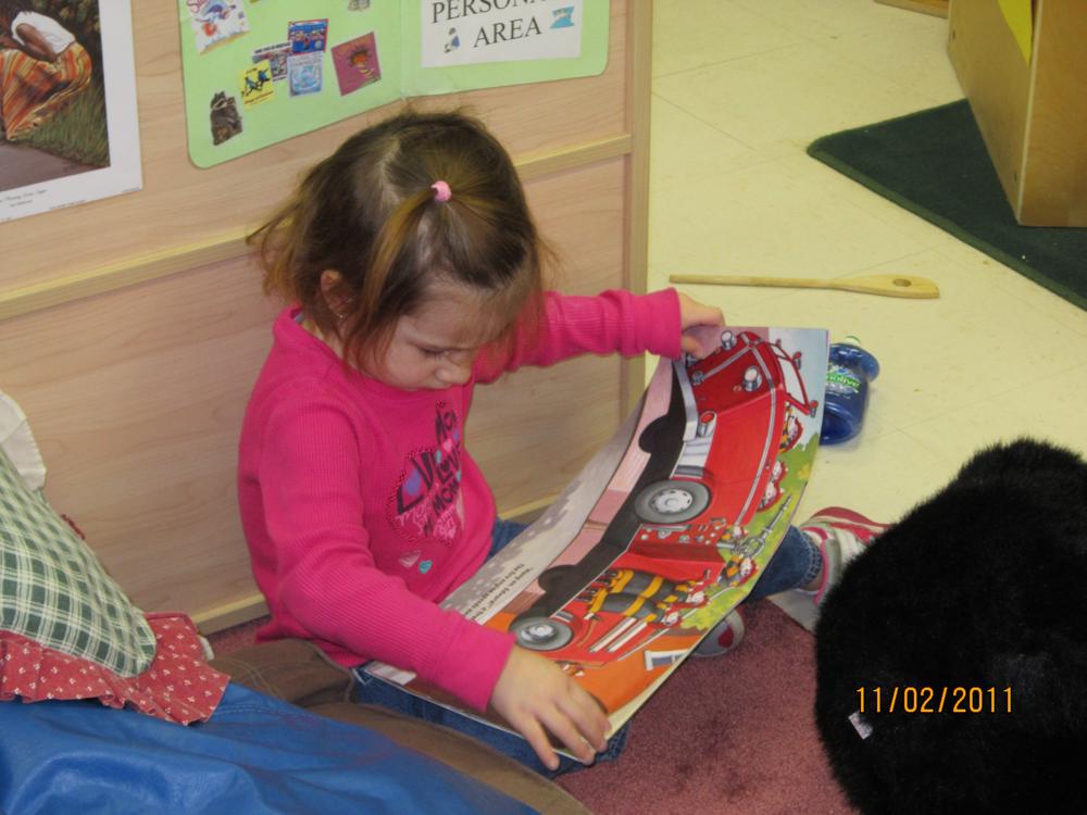 Meghan Stevens as she reads about firetrucks after the visit from Elmo.