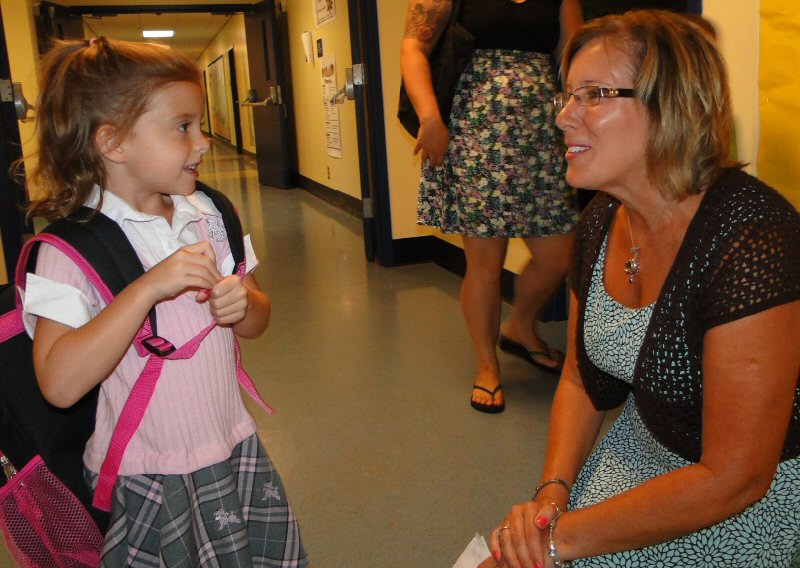 Fitzhugh Park Elementary School Principal Donna Simmons welcomes Cora Shiel to the east side Oswego school during kindergarten orientation.