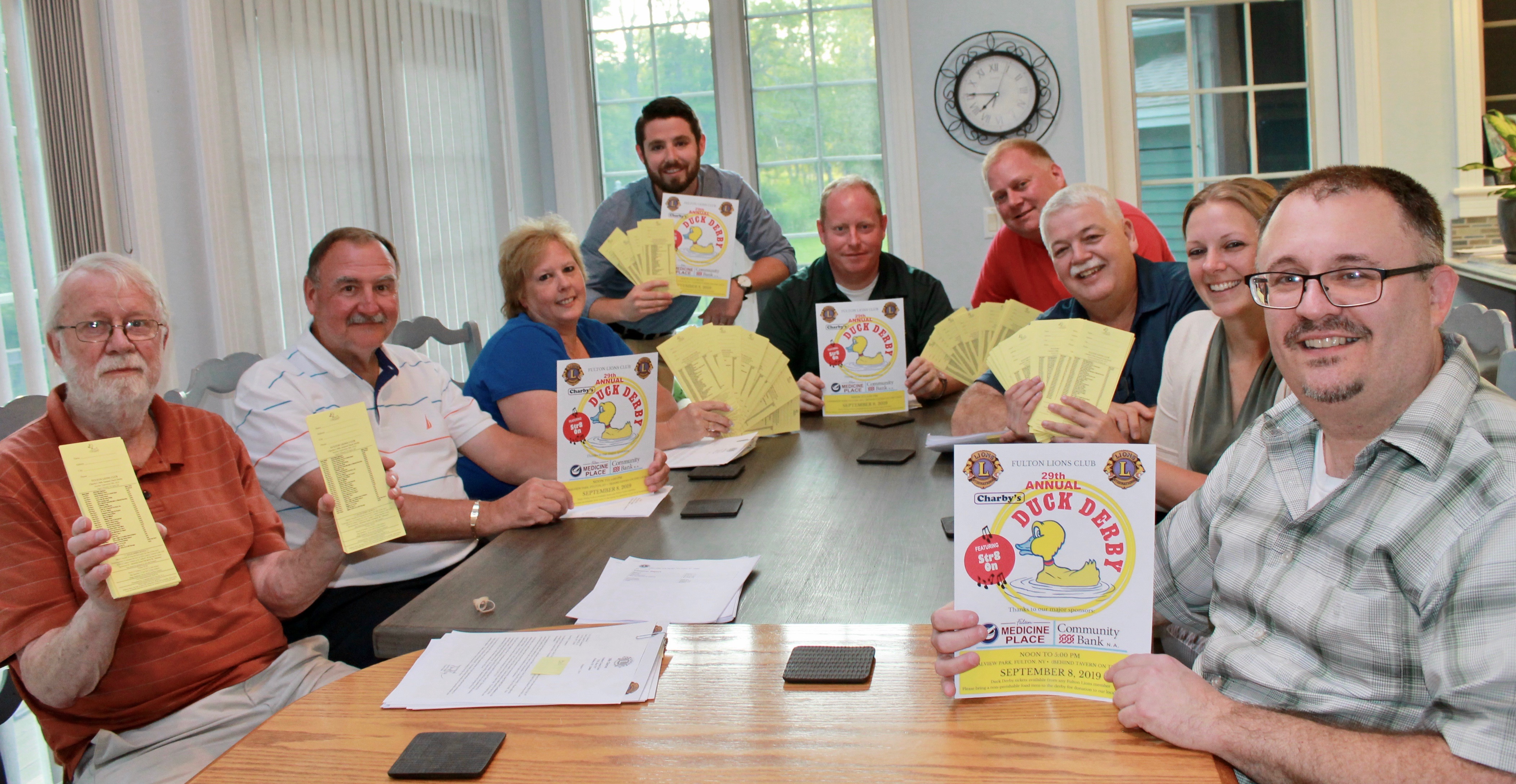 The Fulton Lions Club proudly presents the running of the 29th annual Charby’s Duck Derby, from noon to 5:00 p.m. Sunday, Sept. 8, said David Guyer, club president. Lions gathered recently to prepare for the event, from left: Bob Weston, Paul Foster, Gail Holmes, Zach Merry, immediate past president; Ron Browning, assistant treasurer; David Dingman, Dennis Rupert, Susan Daratt, treasurer; and David Guyer, club president and event chair. Tickets can also be purchased at The Fulton Medicine Place, Chirello Advertising, or from any Fulton Lion. In addition, Lions will be selling tickets at Mimi’s Drive-in from 4:00 to 7:00 p.m., Aug. 22 and 23; and from 8:00 to 11:00 a.m. on Aug. 24 and 25. For further information on Fulton Lions, visit their Facebook page under “Fulton NY Lions, or fultonlionsclub.com.