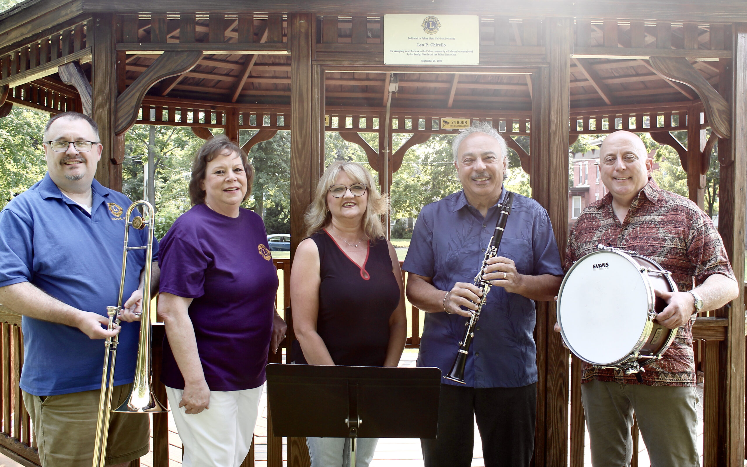 The Fulton Lions Club is sponsoring a concert at Voorhees Park featuring the Anthony Joseph Swingtet at 6:30 – 8:00 p.m., Aug. 5, it was announced by David Guyer, club president. The Swingtet will be playing in the park gazebo, dedicated to Fulton Lion Leo P. Chirello. The club will provide some seating, but people are encouraged to bring their own folding chairs. In addition, there will be ice cream for sale, as well as tickets to the upcoming Charby’s Duck Derby on Sept. 12. Above at the gazebo are, from left: Guyer, Fulton Lions Secretary, Michelle Stanard; Fulton Lion Audrey Avery, Anthony Joseph and Joe Cortini.