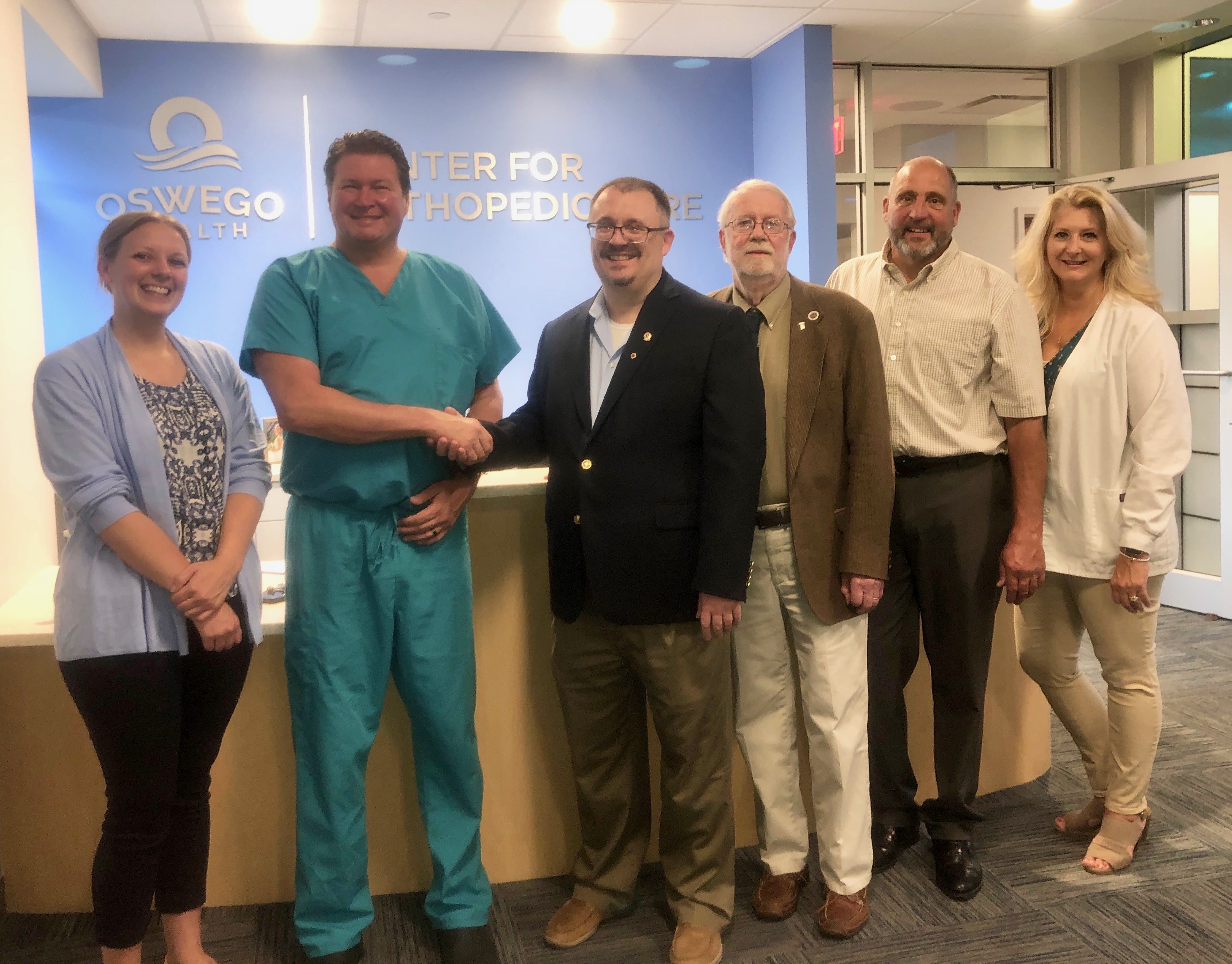 The Fulton Lions Club recently toured Oswego Health’s Center for Orthopedic Care at the Fulton Medical Center, 510 S. 4th St., as part of their September meeting program. The 6.000 sq. ft. facility features comprehensive orthopedic care by two surgeons, offering consultation, x-ray and MRI services, casting, injections, foot taping or padding, and mobility aids. Services include: total knee, hip and shoulder joint replacement; sports medicine; fracture trauma care; hand and wrist; and elbow and shoulder. All surgeries are performed at Oswego Hospital. On hand were, from left: Susan Daratt, Fulton Lions treasurer; Michael Diaz, DO, Oswego Health, who conducted the tour; David Guyer, Fulton Lions president; Lion Bob Weston; Lion Mark Pollock; and Kelly Montagna, RN, Oswego Health. For further information on Oswego Health orthopedic services, visit oswegohealth.org. For more information on Fulton Lions, visit their Facebook page under “Fulton NY Lions, or fultonlionsclub.com.