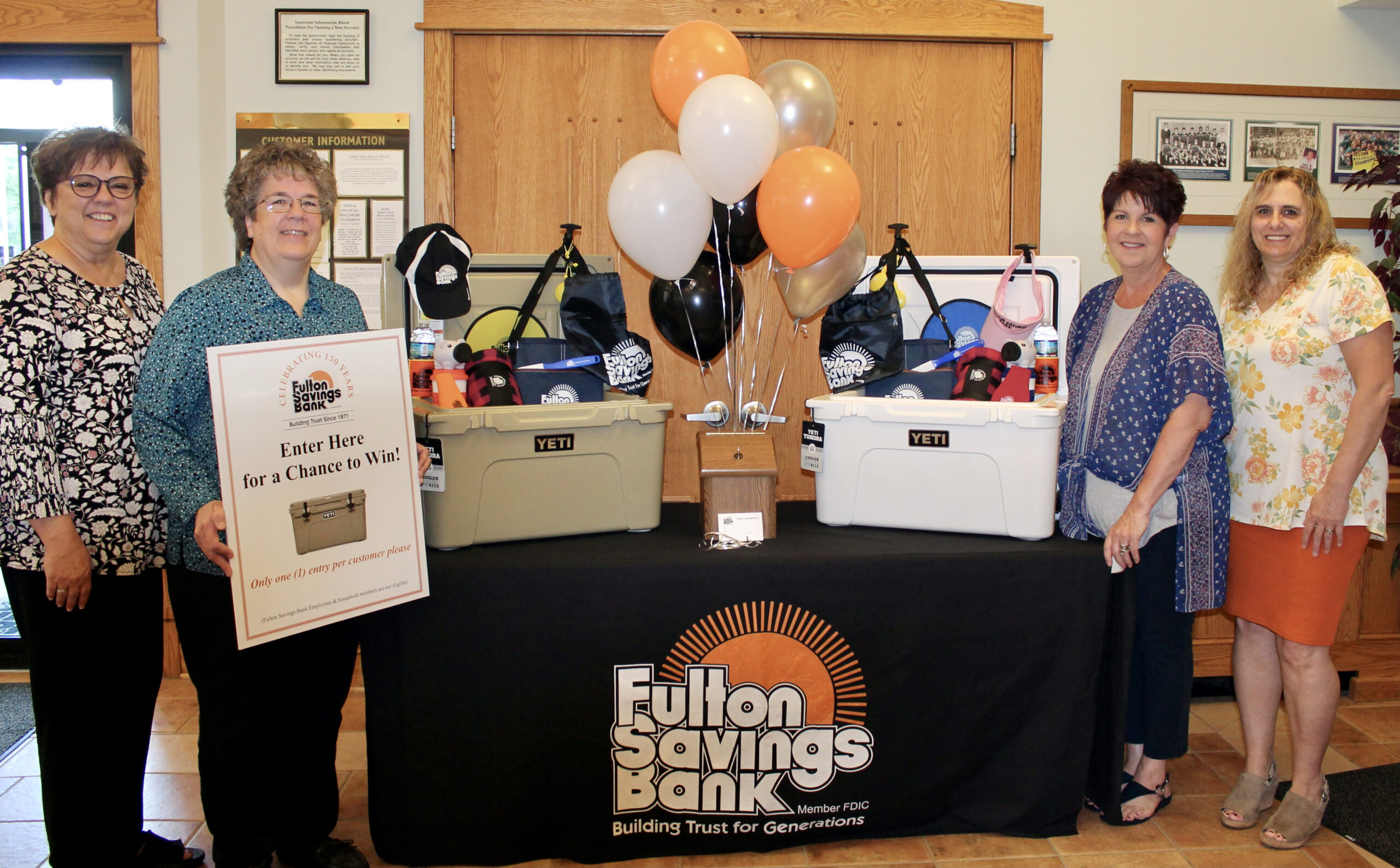 As part of its 150th anniversary celebration, Fulton Savings Bank (FSB), will be offering several customer appreciation activities at all its offices, Aug. 16 – 20, it was announced by Michael Pollock, FSB president and CEO. “We’re working with Mr. Mike’s Seafood and R.F.H.’s Hide-A-Way to offer our customers a free hamburger or hot dog, chips and a drink from 11:00 a.m. to 3:00 p.m. one day during that week at each of our six offices in appreciation for their support, “ Pollock said. “ In addition, we’ll be drawing for chances to win a YETI picnic cooler at each office and offering free customer giveaways. We will also be offering free cookies on Friday, Aug. 20 at each office in support of the CNY Community Arts Center.” Here, employees at the FSB’s main office in Fulton display two of the YETI coolers that will be drawn for as part of the celebration. Fulton office employees from left: Debra Braden, MaryAnn McGregor, Carrie Bixby, and Deborah Barkley.