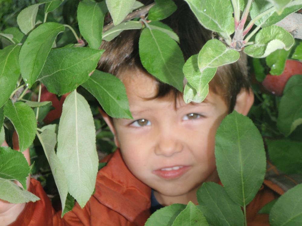 Gerrad Crofoot encumbered in an apple tree looking for just the right apple.