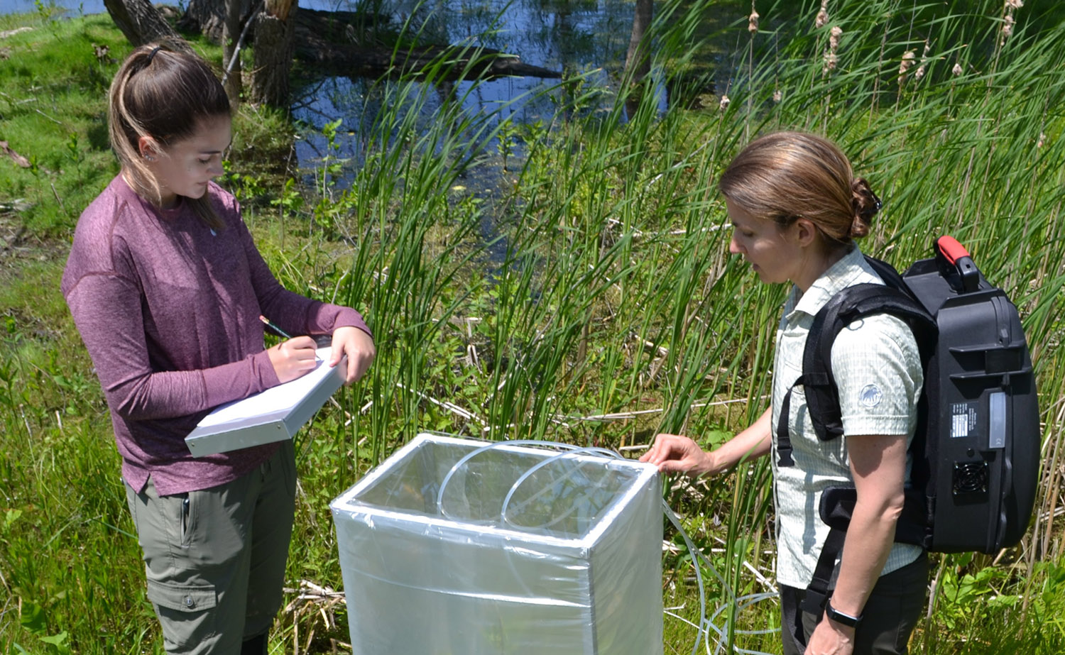 With a Great Lakes Research Consortium grant, Rachel Schultz, Ph.D. and graduate student Courtney Scoles are assessing the effects of cattail treatment on methane emissions from Lake Ontario coastal wetlands. Photo: Jake Straub