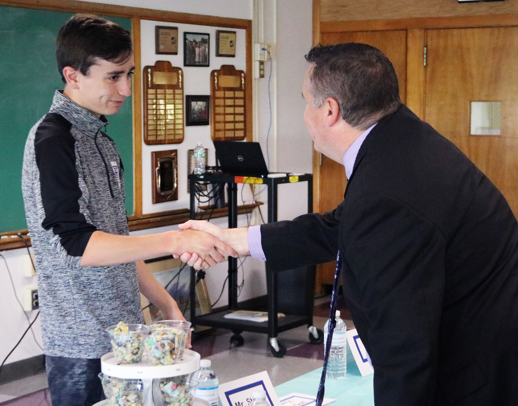 During a mock business presentation, Hannibal High School student Patrick McFarland makes a deal with “investor” Superintendent Christopher Staats for a stake in McFarland’s track shoe company.
