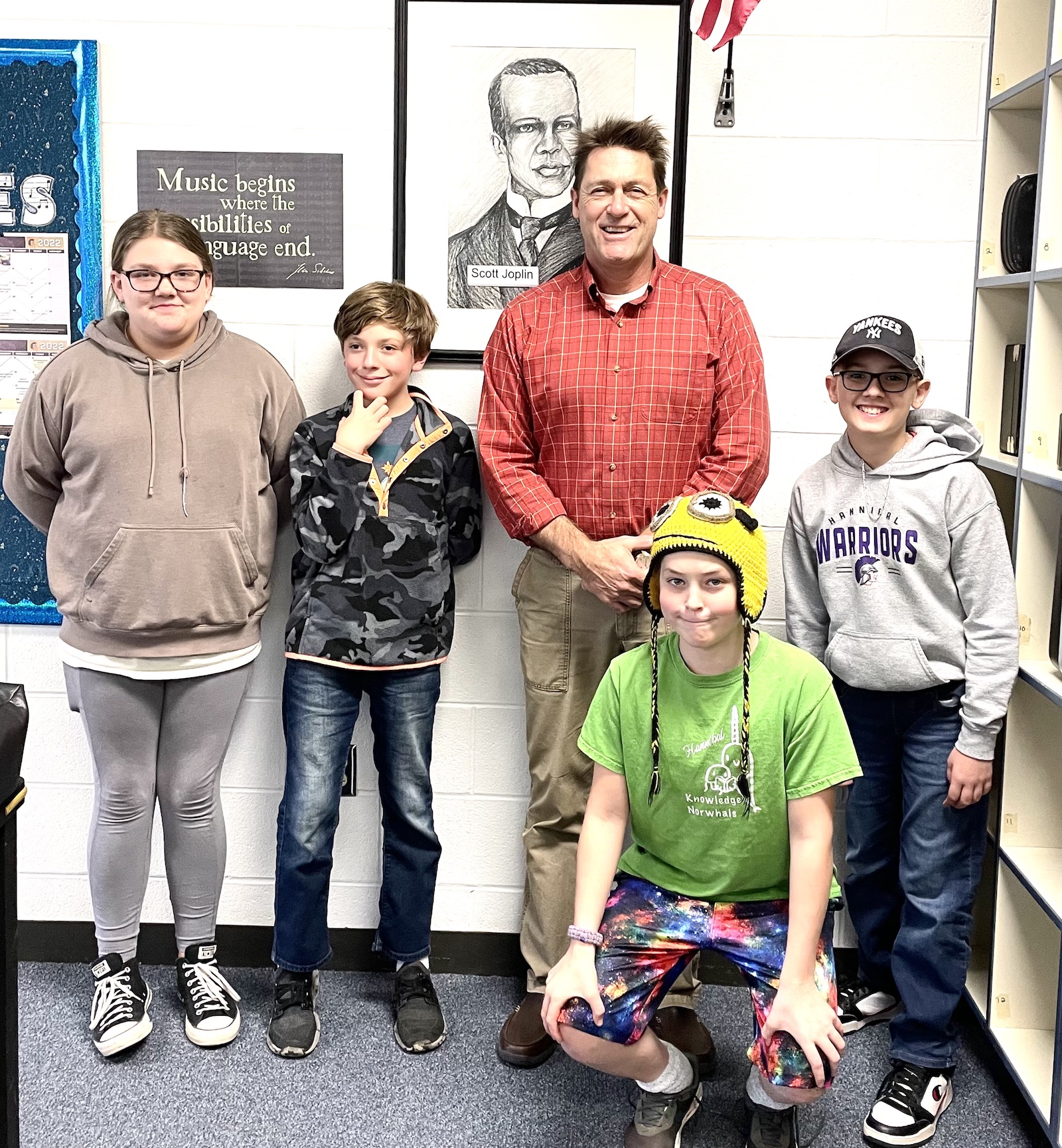 Hannibal sixth-grade band students Myla Manford, Paul Engle, Kai Turaj and Reagan Bonoffski were among those selected to perform at the All-County Festival. Pictured with the Hannibal contingent is music teacher Jeffrey Sawyer.