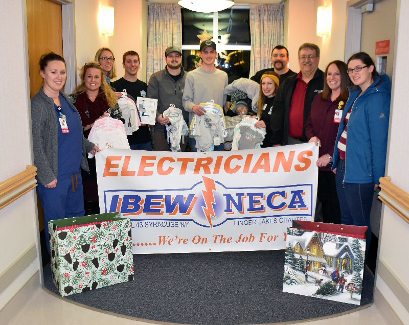 Pictured from left, Nychole Utter, RN; Michele Hourigan and Margaret Barclay, of the Oswego Health Foundation; Apprentices Marverick James, Eamon Lacey, Jake Dumas, and Jesse Kilmer, with Emily and Tessa Kilmer; Rich Shopland, Electrical Training Alliance Instructor; Kim Spurling, Maternity Center Director; and Apprentice Nicole O’Brien.