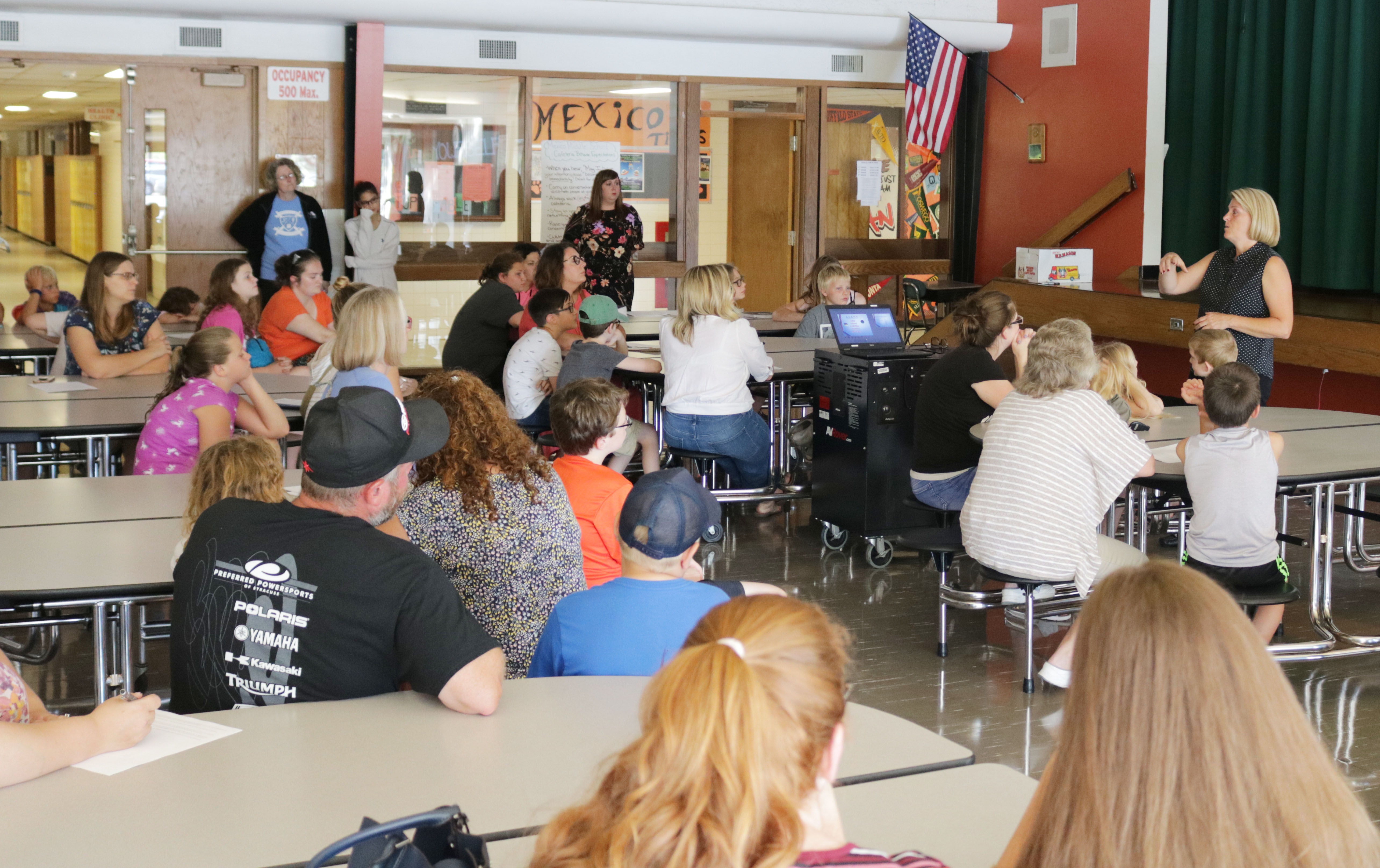 Mexico Middle School Principal Kimberly Holliday, standing at right, speaks to a group of students and families at a recent fifth grade orientation night.
