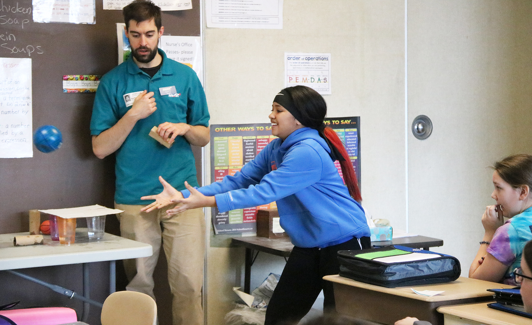 Kennysse Brockington, a Kingsford Park Elementary School sixth grader, readies to catch a ball during an ‘astronaut catching game,” as part of an experiment related to Newton’s Laws of Motion. That activity, and several others, were featured in a presentation from the Milton J. Rubenstein Museum of Science & Technology’s Science on the Go program.