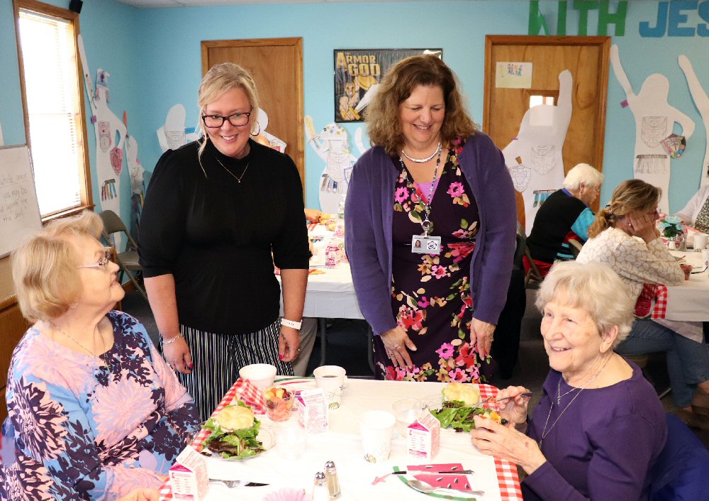 Allison Griffin of Oswego County Opportunities Nutrition Services (standing left) and Sara Sunday, Oswego County Aging Services Administrator (standing right), visit with guests at the recent open house luncheon.