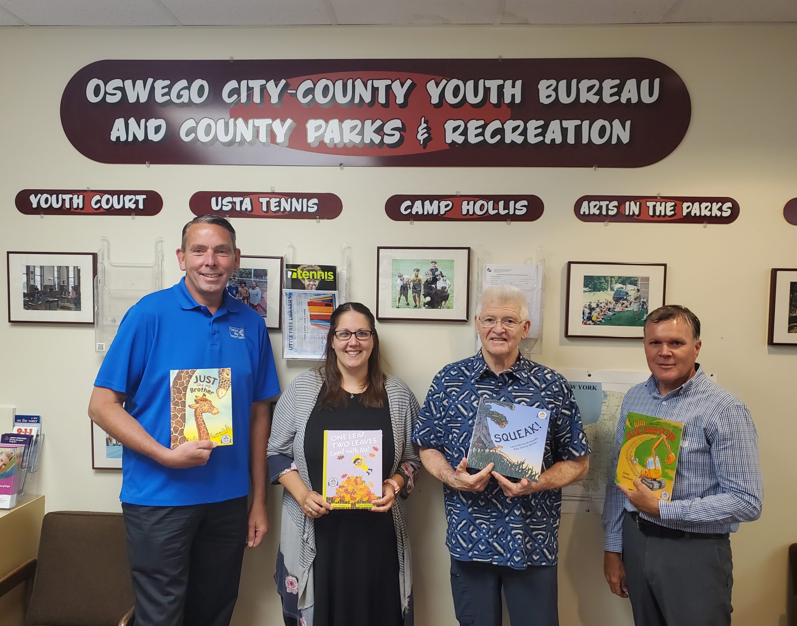 The United Way of Greater Oswego County, (UWGOC), a partner of The Literacy Coalition of Oswego County (LCOC), was recently awarded a $1,000 mini-grant from the Oswego City-County Youth Bureau (OCCYB), for Dolly Parton’s Imagination Library program, which is offered through LCOC. Showing examples of the kinds of books offered through the program are, from left: Patrick Dewine, executive director, United Way of Greater Oswego County; Tiffany Halstead, OCCYB mini-grant coordinator; Mike Egan, past LCOC president; and Brian Chetney, executive director, OCCYB.