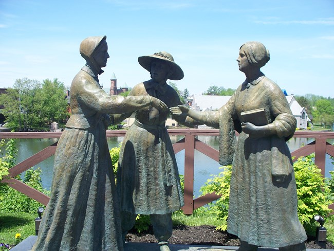Pictured is a life-size bronze memorial monument entitled “When Anthony met Stanton,” which overlooks the Seneca River in Seneca Falls. This is a tribute to a momentous time in American history when women’s rights pioneer and dress reformer Amelia Bloomer introduced Susan B. Anthony to Elizabeth Cady Stanton for the first time in 1851. Together they famously dedicated their lives to equality and the right to vote. Those who join the bus tour on July 10 will have an opportunity to see the statue in person. (Photograph courtesy of the National Park Service)