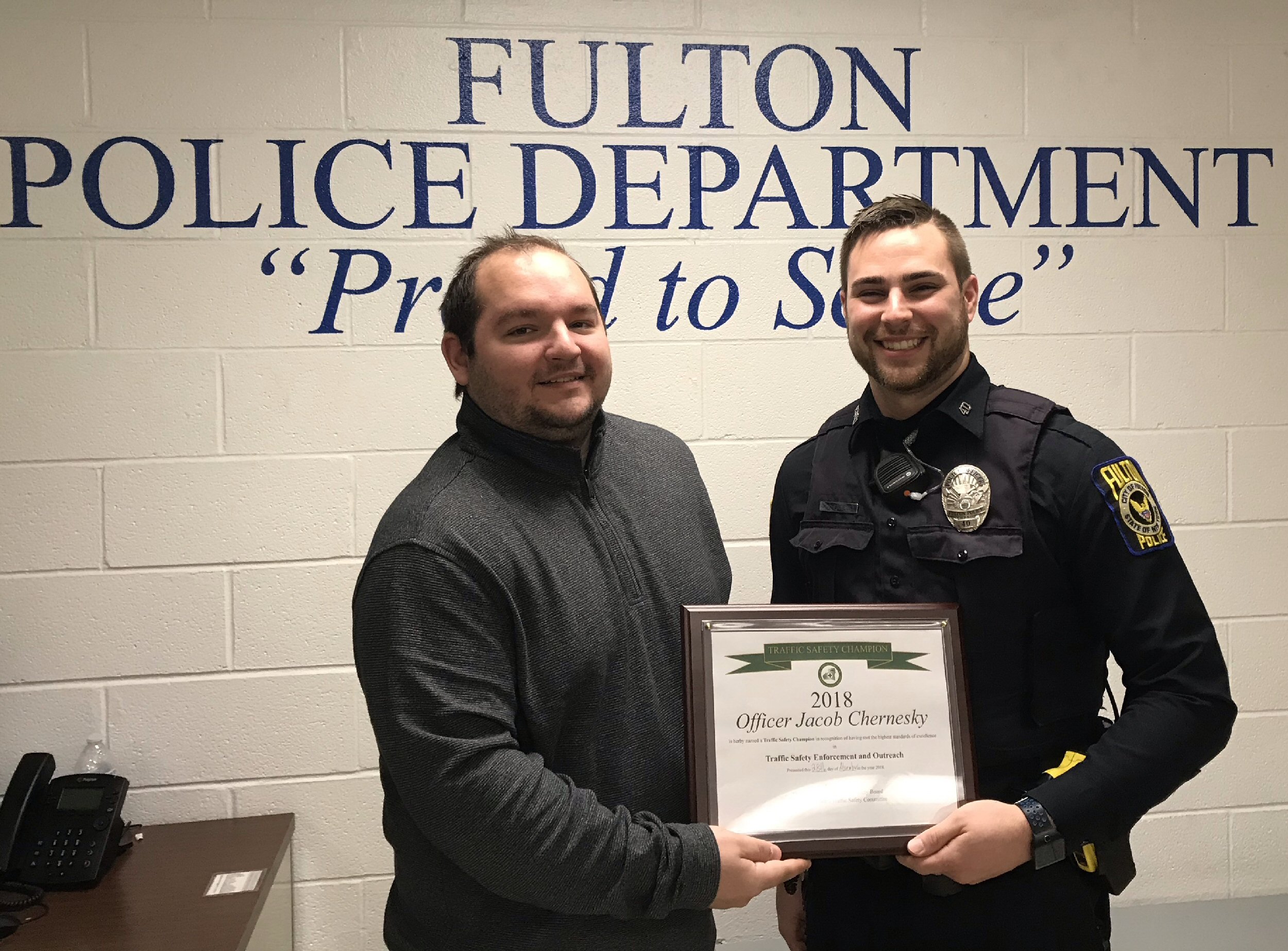 Pictured are Officer Jacob Chernesky with Traffic Safety Board Coordinator Kyle Boeckmann