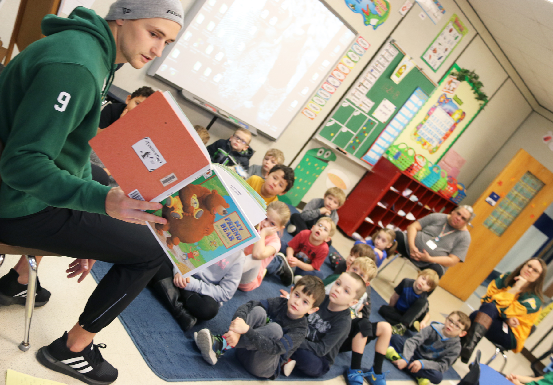 Oswego State Men’s Ice Hockey Team member Mitch Emerson reads “My Friend Bear” to Minetto Elementary first graders during the team’s recent visit to the school.