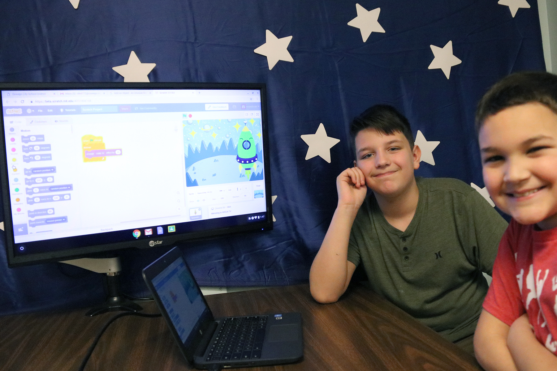Kingsford Park Elementary School fifth graders Johnathan Budd and Noah Whalen show off the progress they made during a coding activity in teacher Kelly Moxley’s classroom.