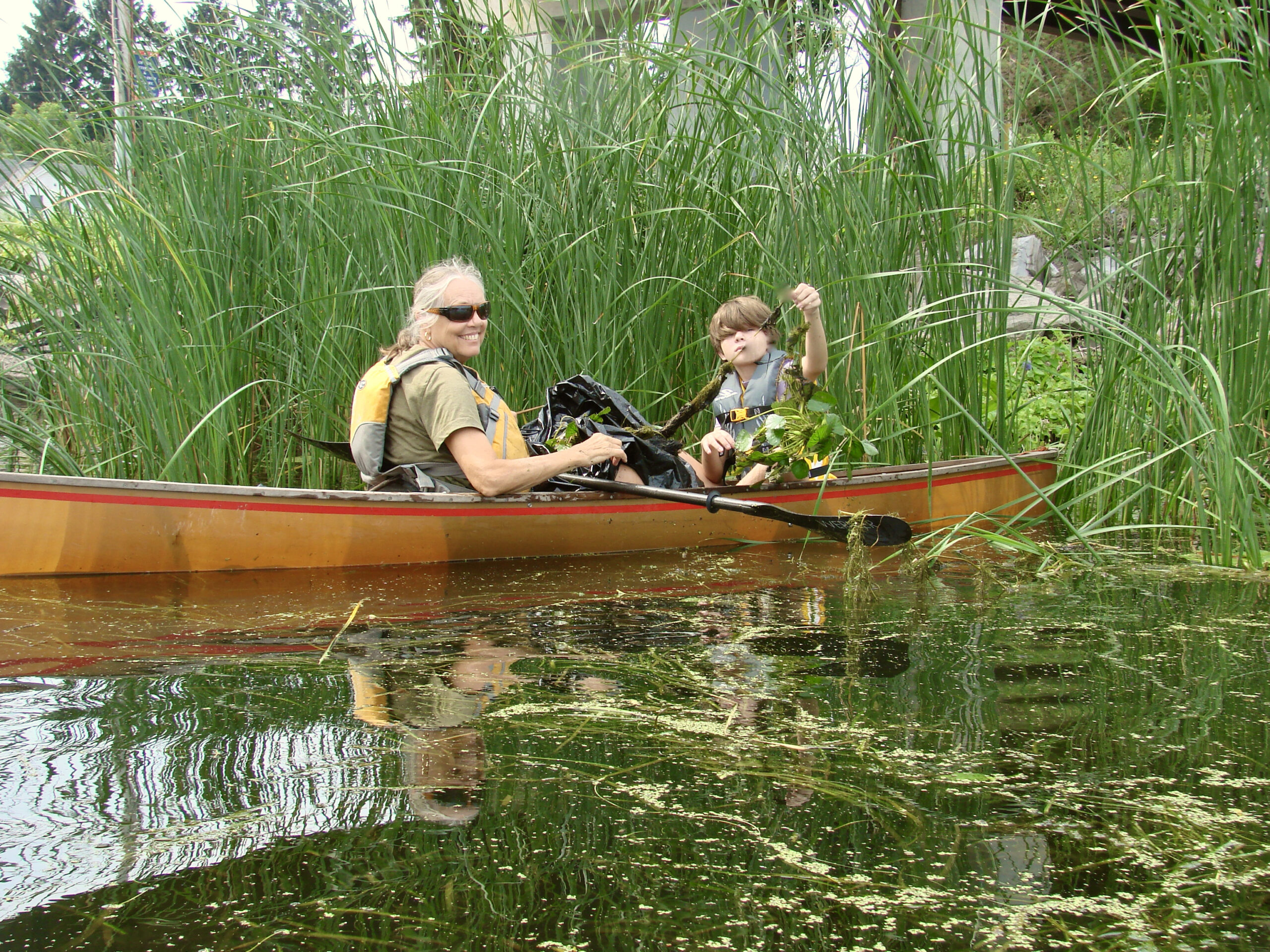 Ellen Wahl and granddaughter, Luna, a family team pull and collect the Water Chestnut rosettes.