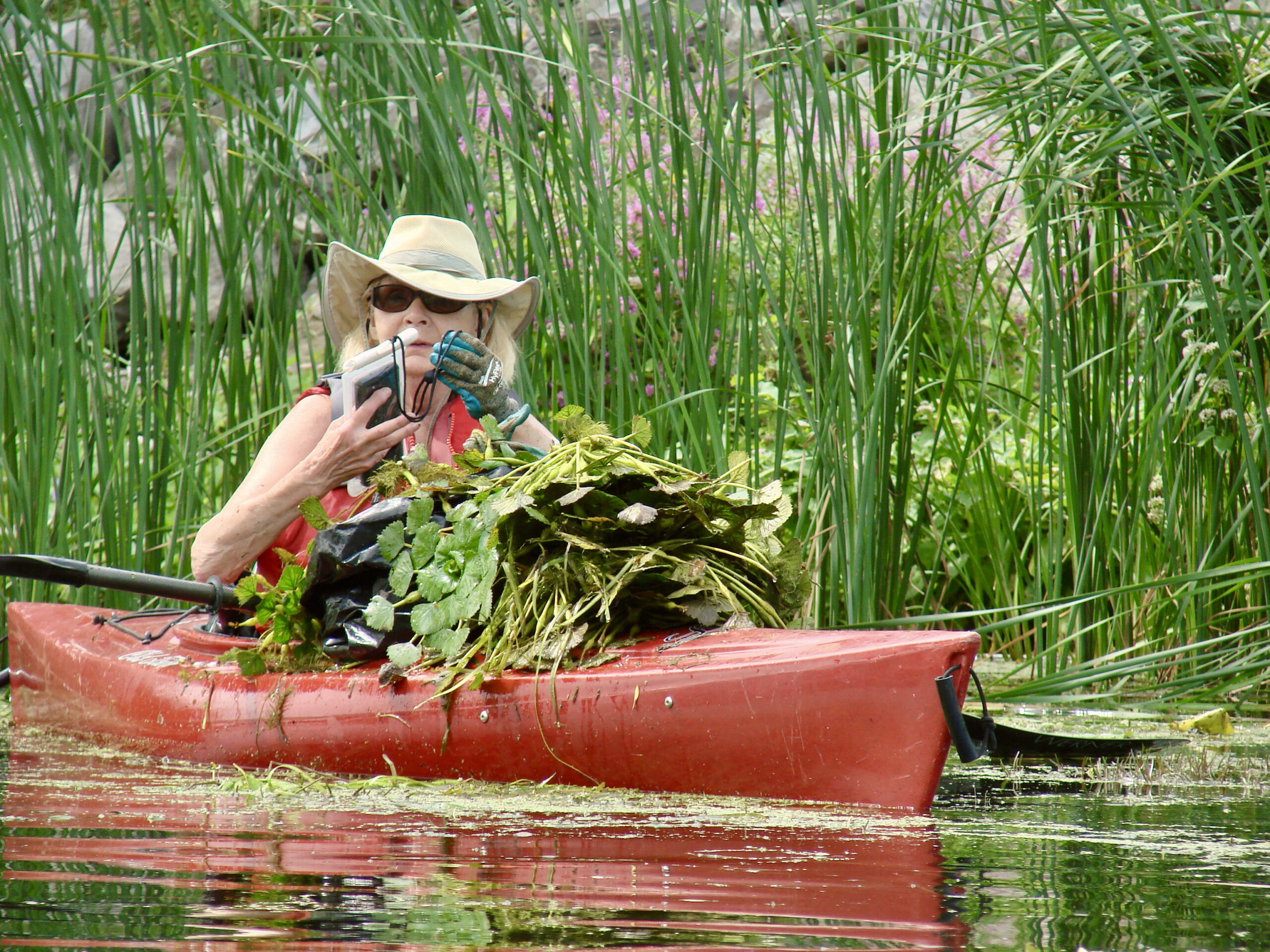 Mike Tafle, left and Rick Kaulfuss, transport the group’s collected Water Chestnuts.