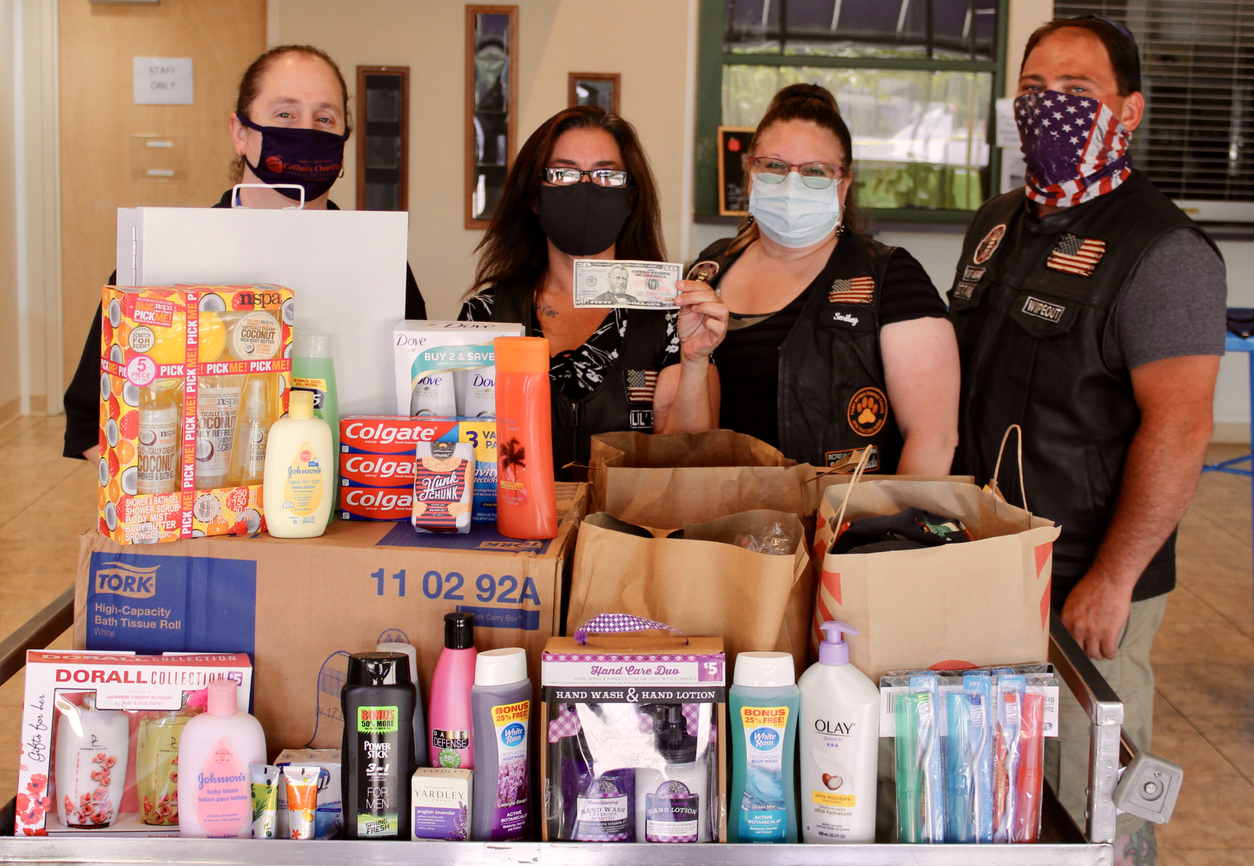 Members of the Port Ontario Gear Rippers motorcycle club recently donated cash and hygiene items to Catholic Charities of Oswego County, (CCOC). “We appreciate the support the Gear Rippers have given us and the people in our county that this donation will help,” said Mary-Margaret Pekow, CCOC executive director. From left: Pekow, Katrina Zakala, a CCOC employee and member of the Gear Rippers, Shelley Ingison and David Wait. Absent from photo are Gear Rippers members Andy Ingison, Eric Rose and Salvatore Licitra. For more information on supporting CCOC, contact Catholic Charities of Oswego County at 315-598-3980. For more information on CCOC, visit https://ccoswego.com or find them on Facebook.