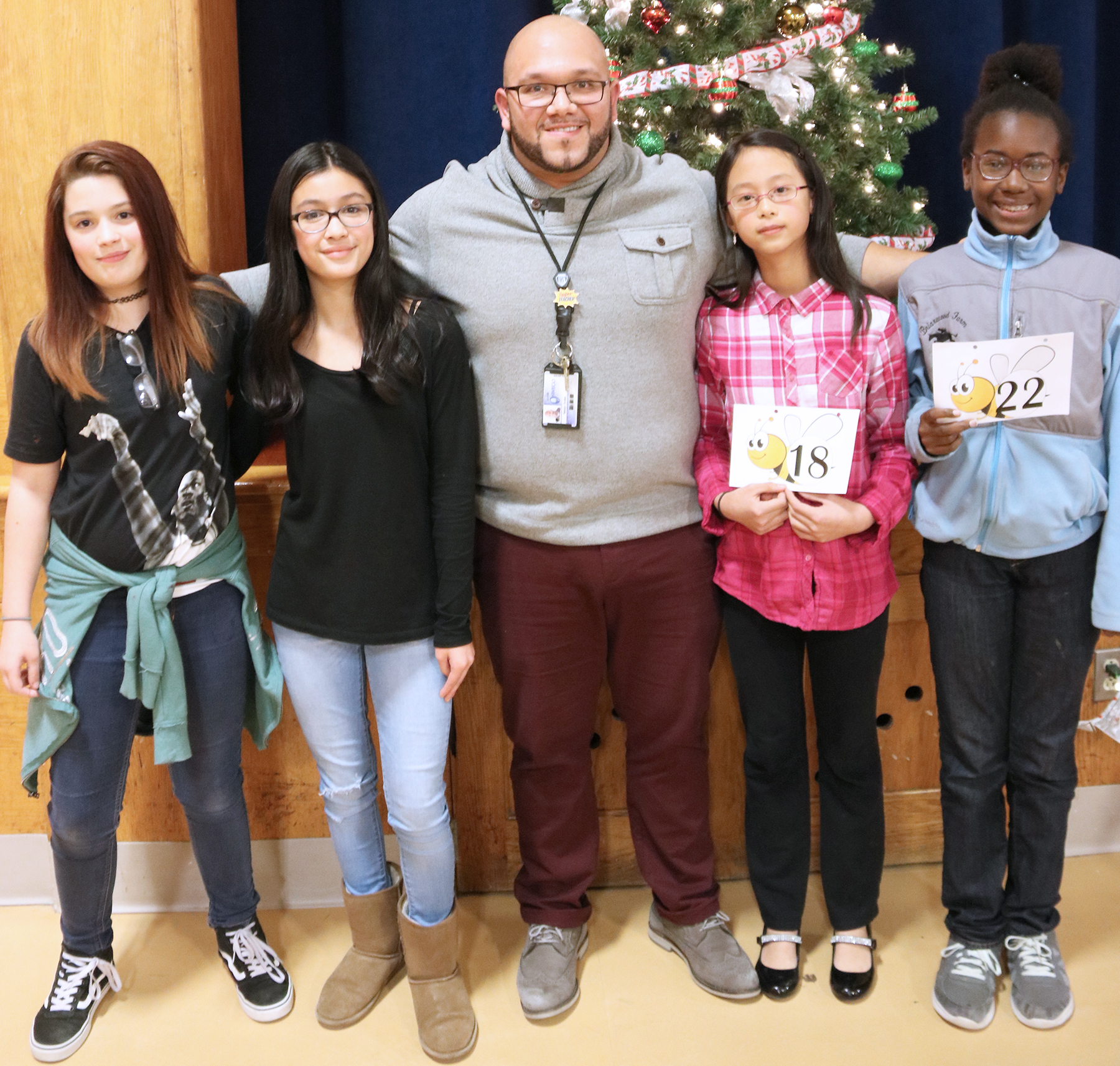 Riley spelling bee winners: Lauren Isham, Mackenzie Bennett, Angelia Lin and Kadae Hunley have advanced to the Oswego City School District spelling bee. They are standing with fifth grade teacher Nestor Aviles, who assisted with the school event.
