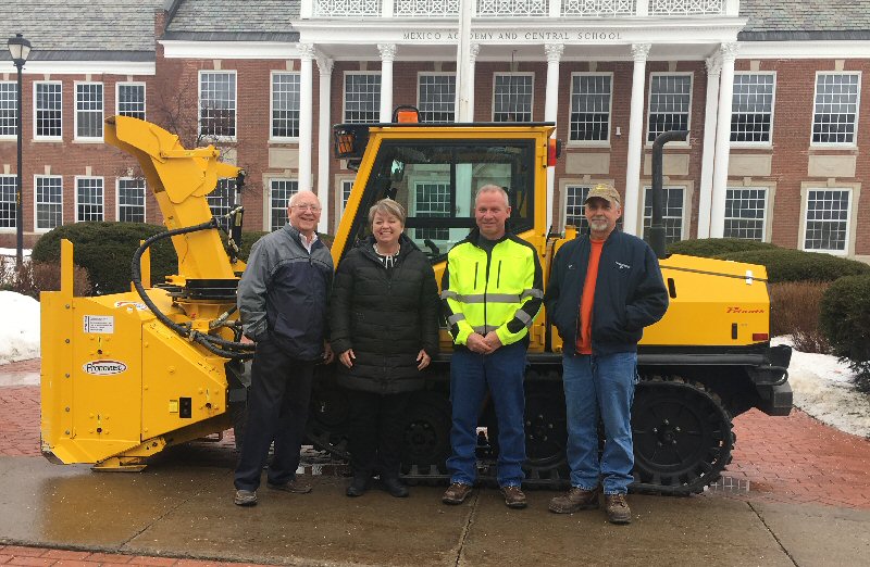 Senator Patty Ritchie is joined at the Mexico High School by village of Mexico Trustee and Deputy Mayor Jim Hotchkiss (left), DPW Superintendent John Power (right center) and DPW Mechanical Equipment Operator Bill Francis (right) in front of the new Prinoth SW4S Track machine.