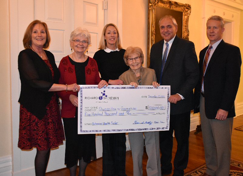 Pictured at the formal check presentation from left are Shineman Foundation Executive Director Karen Goetz, Shineman Foundation Chairman Kathy Fenlon, along with Oswego Health Foundation Executive Director Margaret Barclay, Shineman Foundation Founder Barbara Shineman; Oswego Health President and CEO Michael Harlovic and Oswego Health EVP and Oswego Hospital COO Jeff Coakley.