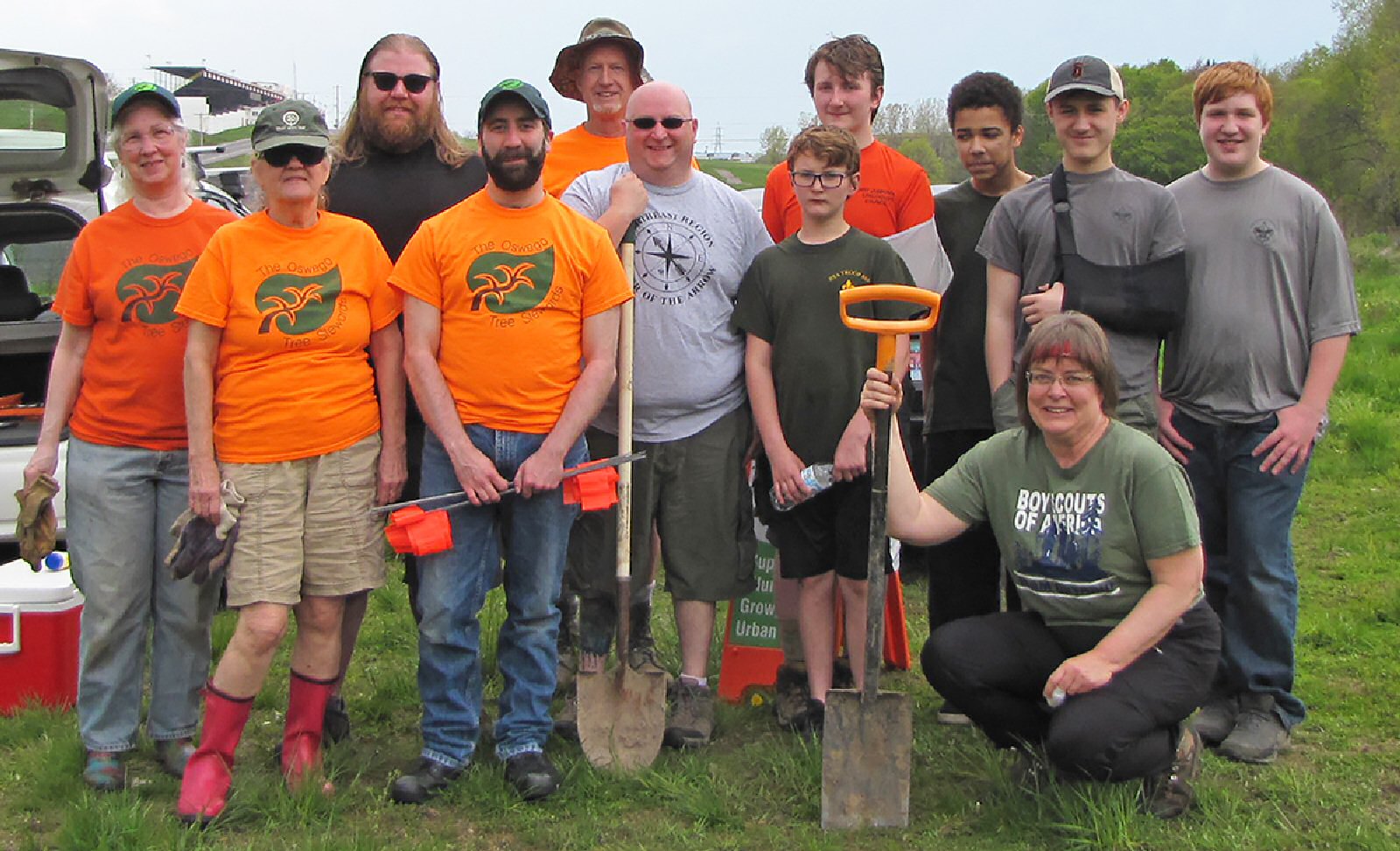 Oswego Tree Stewards and Boy Scouts of America Troop #888 recently met to plant trees along Wine Creek in Oswego. Pictured kneeling is Oswego County Associate Planner Karen Noyes. Pictured standing in the front row from left are Valerie Dawnstar, June MacArthur, Jonathan Ashline, James Loomis, Connor Loomis, Zack Kinney and Skyler Sweeting. Pictured standing in the back row from left are Christian Sweeting, Phil MacArthur, Alex Loomis and Ricky Green.