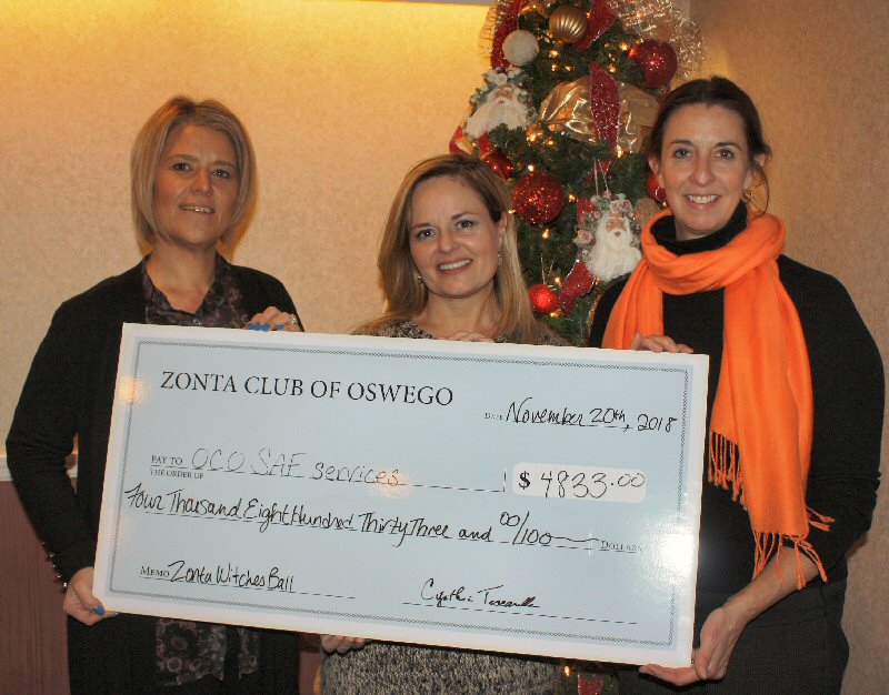 Zonta Club of Oswego helps cast out violence with proceeds from the 2nd Annual Witches Ball. From left are Director of OCO Crisis & Development Services Cristy King, Witches Ball chairperson Tammy Elowsky, and Zonta Club of Oswego President Inga Back.