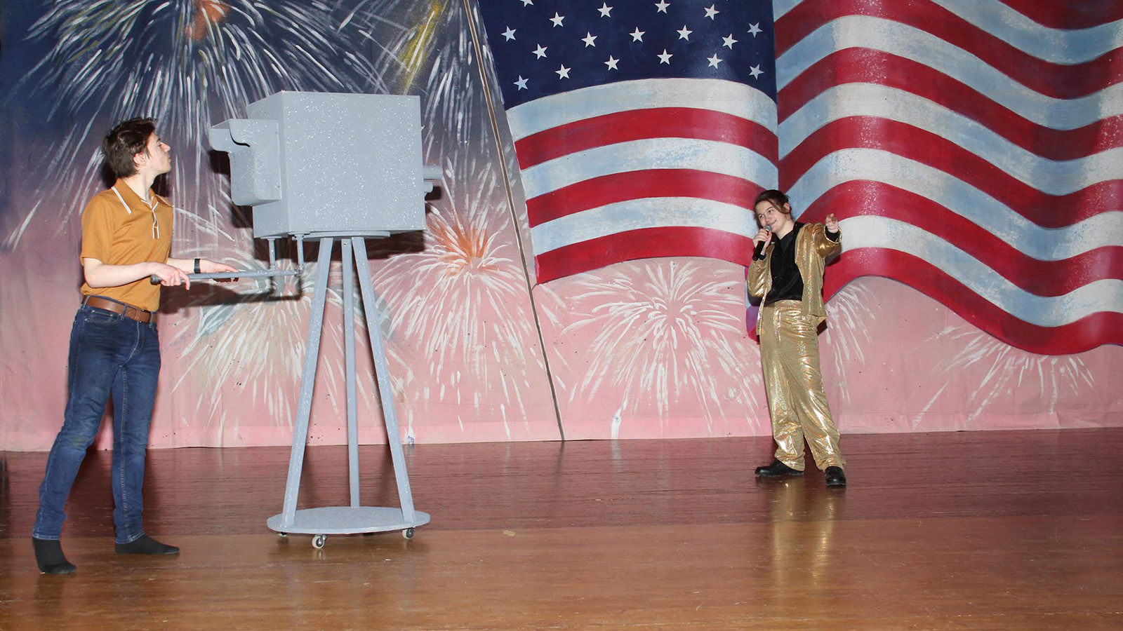 Before he is drafted in the army, rock and roll sensation Conrad Birdie (Sutter Lewin – right) is preparing to bestow one last kiss upon a typical American fan, Kim MacAfee. Birdie is shown here singing his latest hit on The Ed Sullivan Show as cameraman Nathan Jackowski looks on. Photo by Dave Dayger.