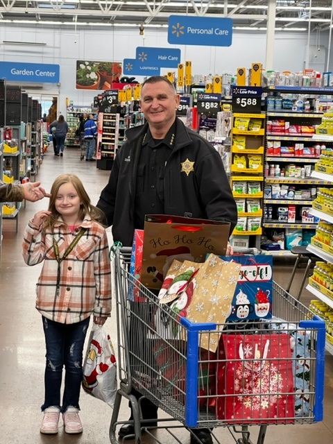 Sheriff Hilton guides his shopping buddy with her wrapped gifts through the store. Photo from OCSO.