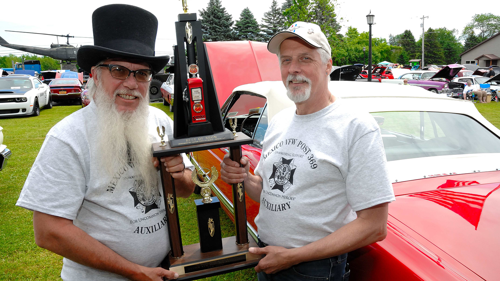 Mexico VFW car Show organizers Jeff Beardslee and Fran Moshier with the best in Show trophy.