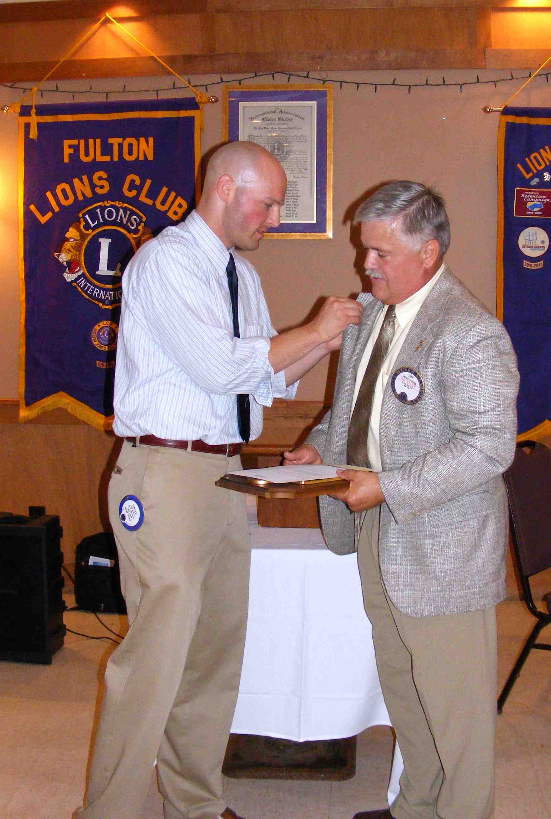 Lion Past President Leonard Kellogg, right, receives Lions Clubs International’s Melvin Jones Fellowship from Fulton club President Fred Aldrich. A Melvin Jones Fellowship is the highest honor that Lions International can bestow, Aldrich said. This award recognizes a person’s commitment to humanitarian service.