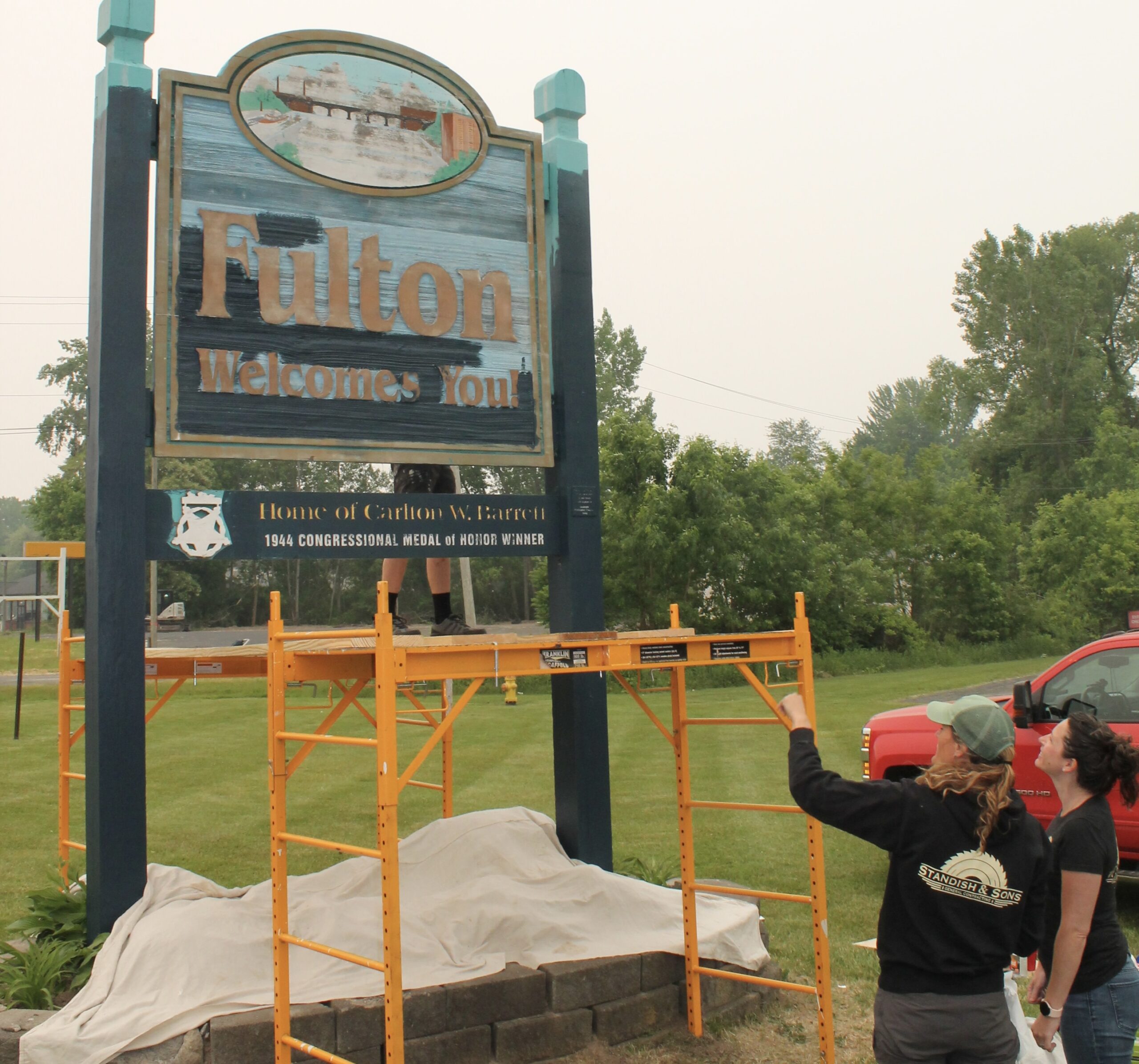 The five main entrance Welcome signs on the roads leading into Fulton now sport a fresh look with a new paint scheme and restored artwork. Jennifer Standish, left, co-owner of Standish and Sons General Contracting points to mural restoration work to co-worker Tania Samson at the sign located in front of NBT Bank on Route 3. Photo provided by Chirello Marketing.