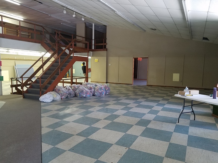 After moving the pictured staircase, the main level of CNY Arts Center will hold an open two-level stage, audience seating for 100 people, and a startup culinary entrepenuer kitchen space.