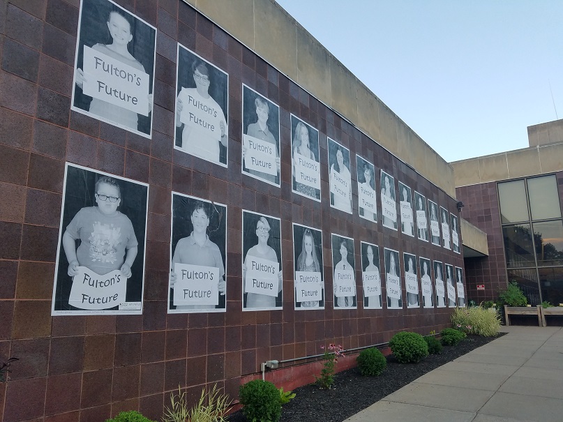 CNY Arts Center hangs giant pictures of “Fulton’s Future” signs in the hands of young ones on City Hall.