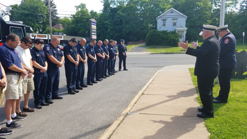 Those in attendance at the remembrance ceremony join Father John Canarro in prayer.