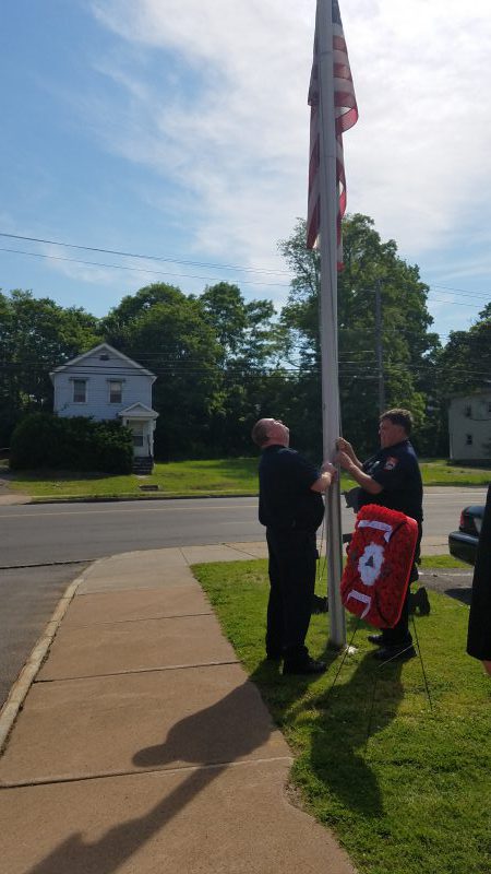Members of duty shift lower the flag to half staff during a moment of silence.