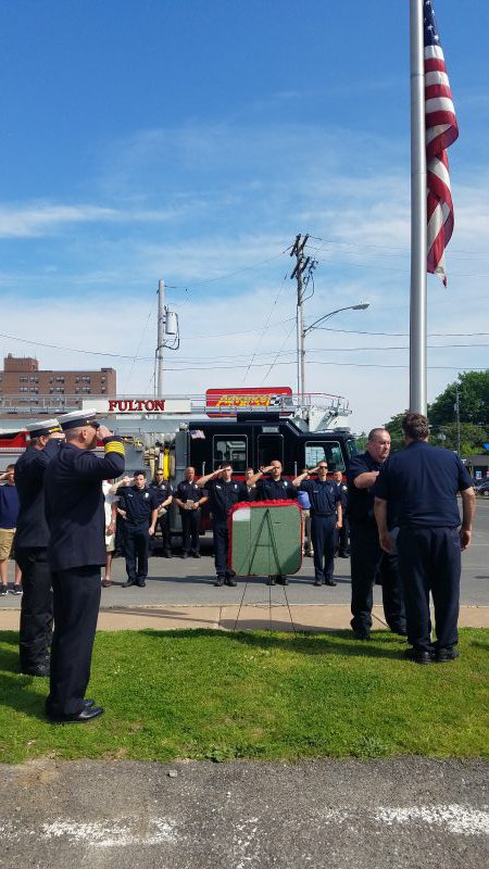 Fulton firefighters stand at attention as the flag is lowered to half staff.